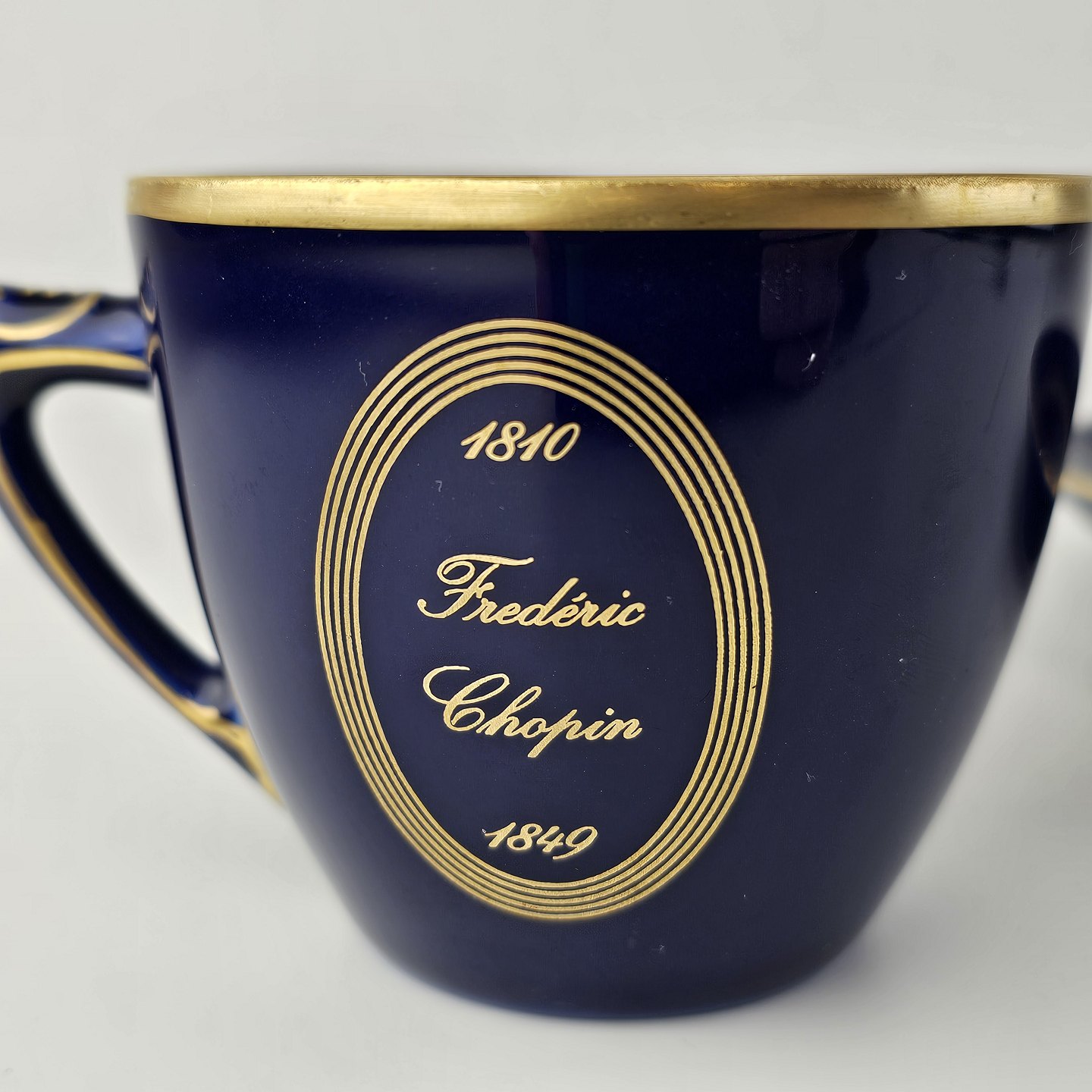 Komponist er blåt porcelæn med dekoration i guld i tema efter komponister