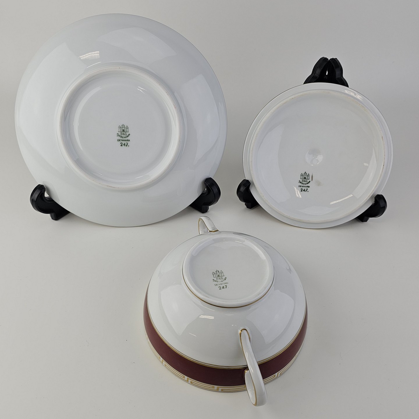Service i porcelæn med rød bort, græsk inspireret guld bort og guldkant
