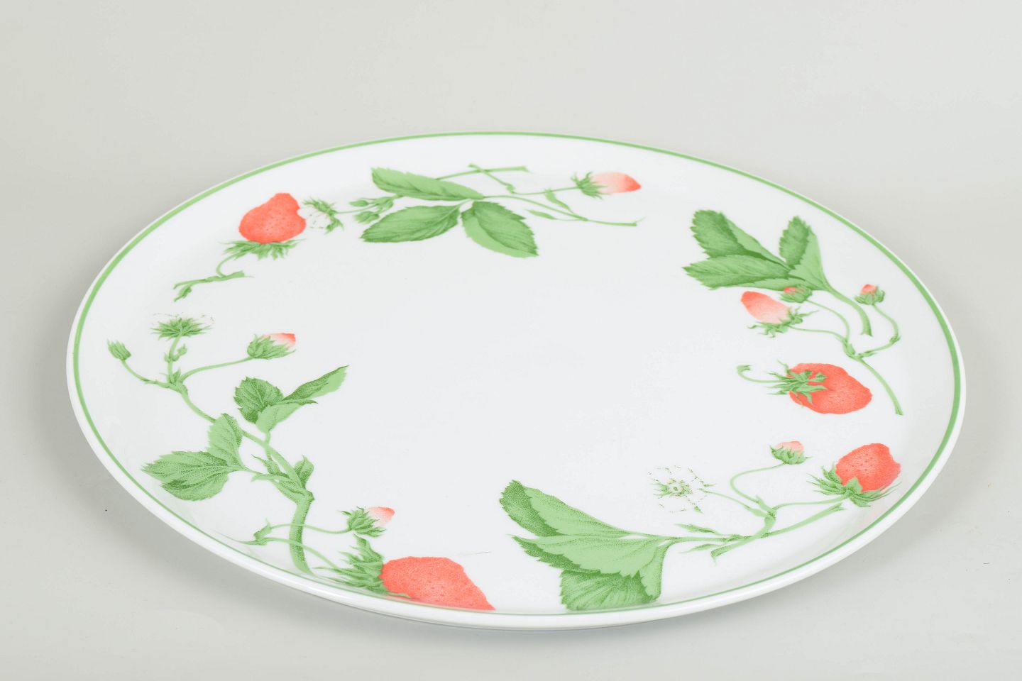 Stort rundt serveringsfad, lagkagefad i porcelæn med dekoration af jordbær og blade langs kanten i serien Fraise.
