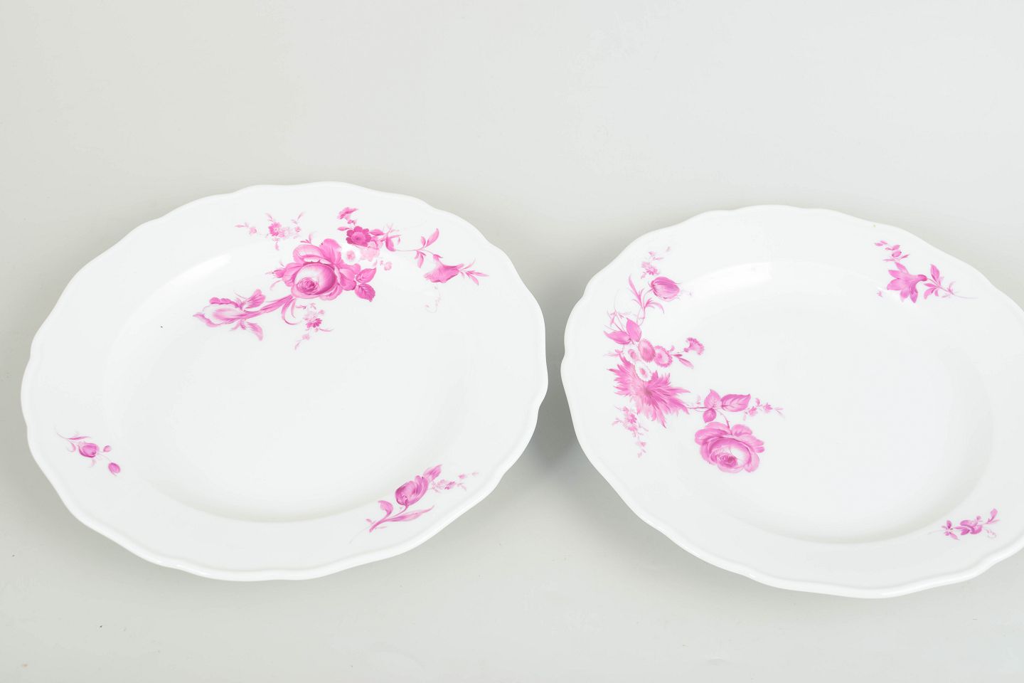 To tallerkener i hvidglaseret porcelæn dekoreret med håndmalede blomster i rosa nuancer.