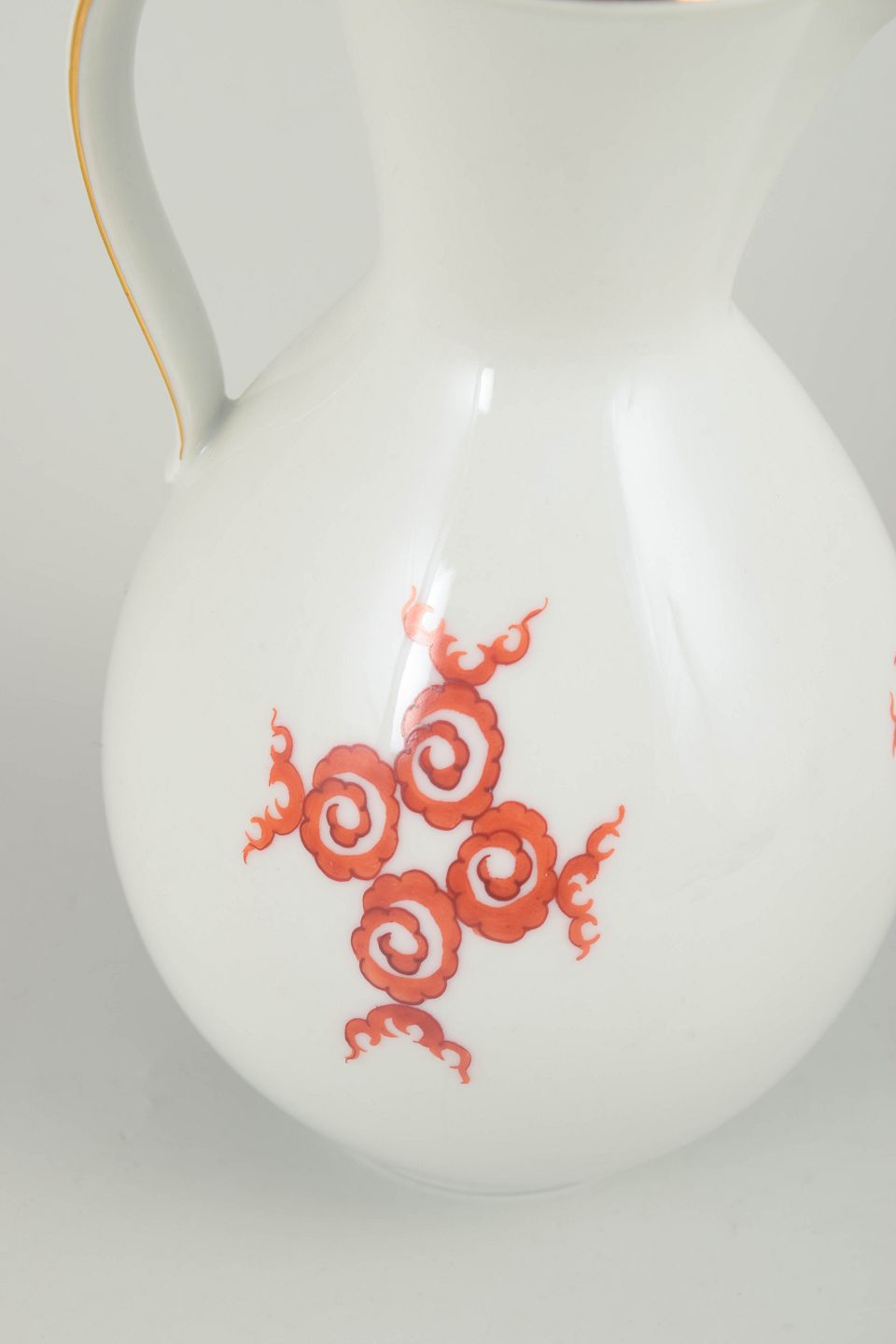 Balusterformet kande i hvidglaseret porcelæn dekoreret med rød Mingdrage og forgyldt kant. Modellen er fremstillet i Meissen-området og er ikke produceret af den kongelige Meissen-manufaktur.