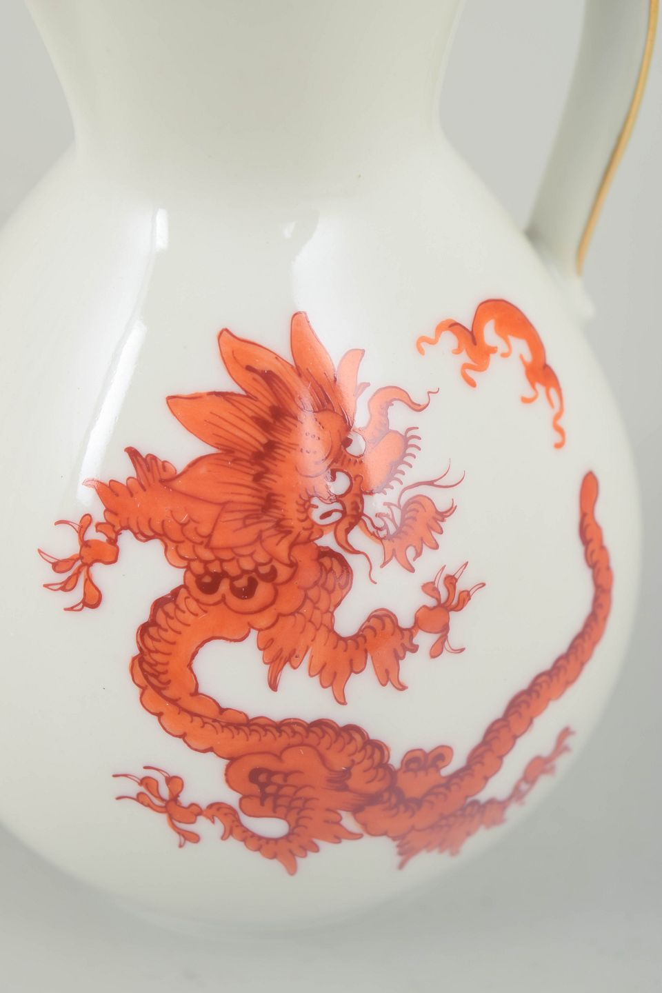 Balusterformet kande i hvidglaseret porcelæn dekoreret med rød Mingdrage og forgyldt kant. Modellen er fremstillet i Meissen-området og er ikke produceret af den kongelige Meissen-manufaktur.