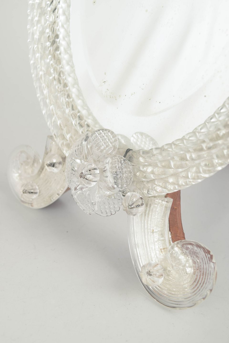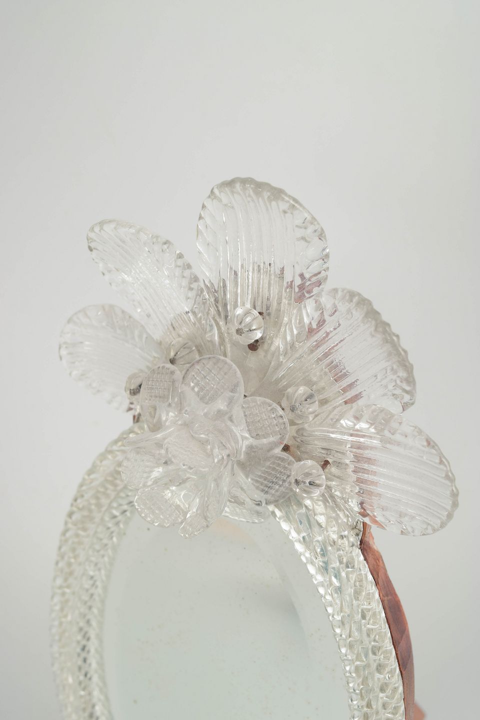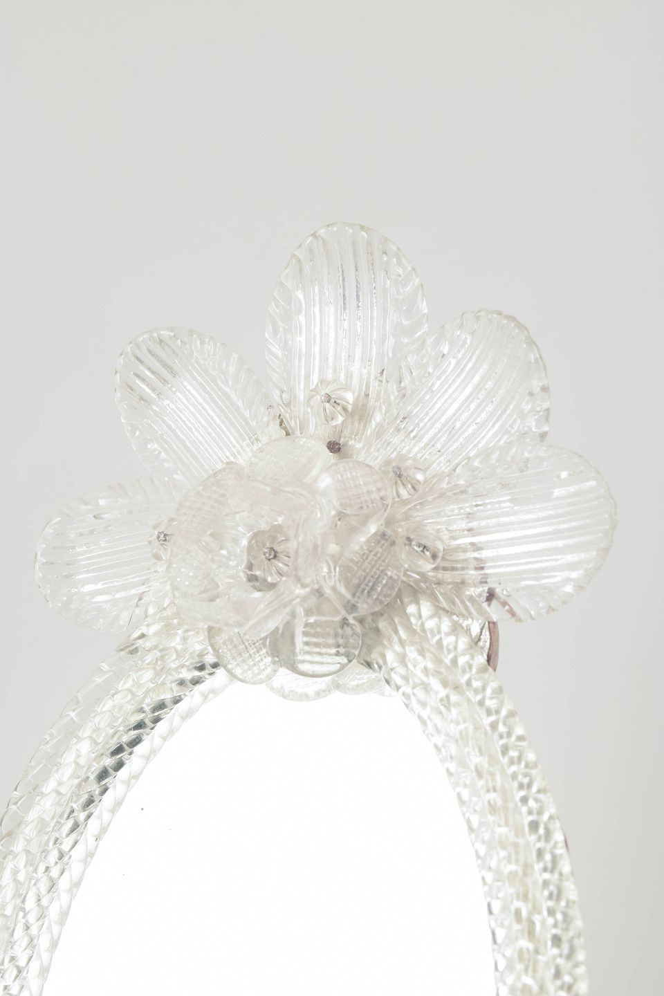 Ovalt spejl med rigt dekoreret ramme i klart glas, udført med blomster- og bladdekor samt fødder i samme stil; Murano.