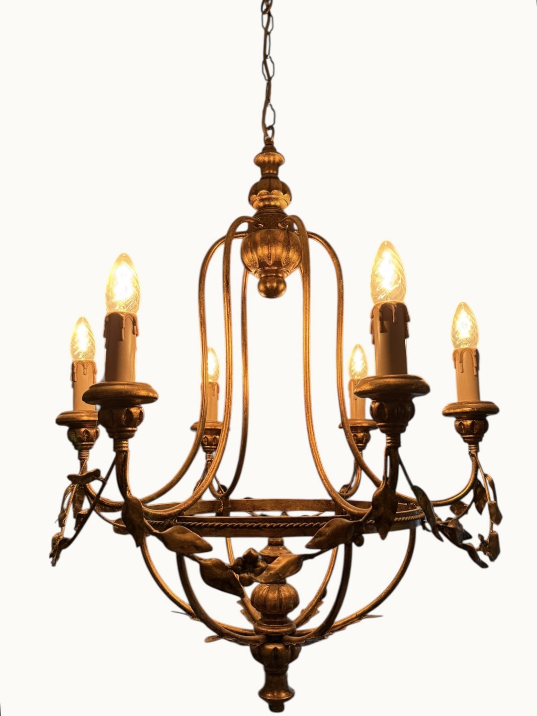 Burformet metal og træ lysekrone til elektricitet i Louis XVI stil, diameter ca. 60cm *fin og funktionsdygtig stand*
