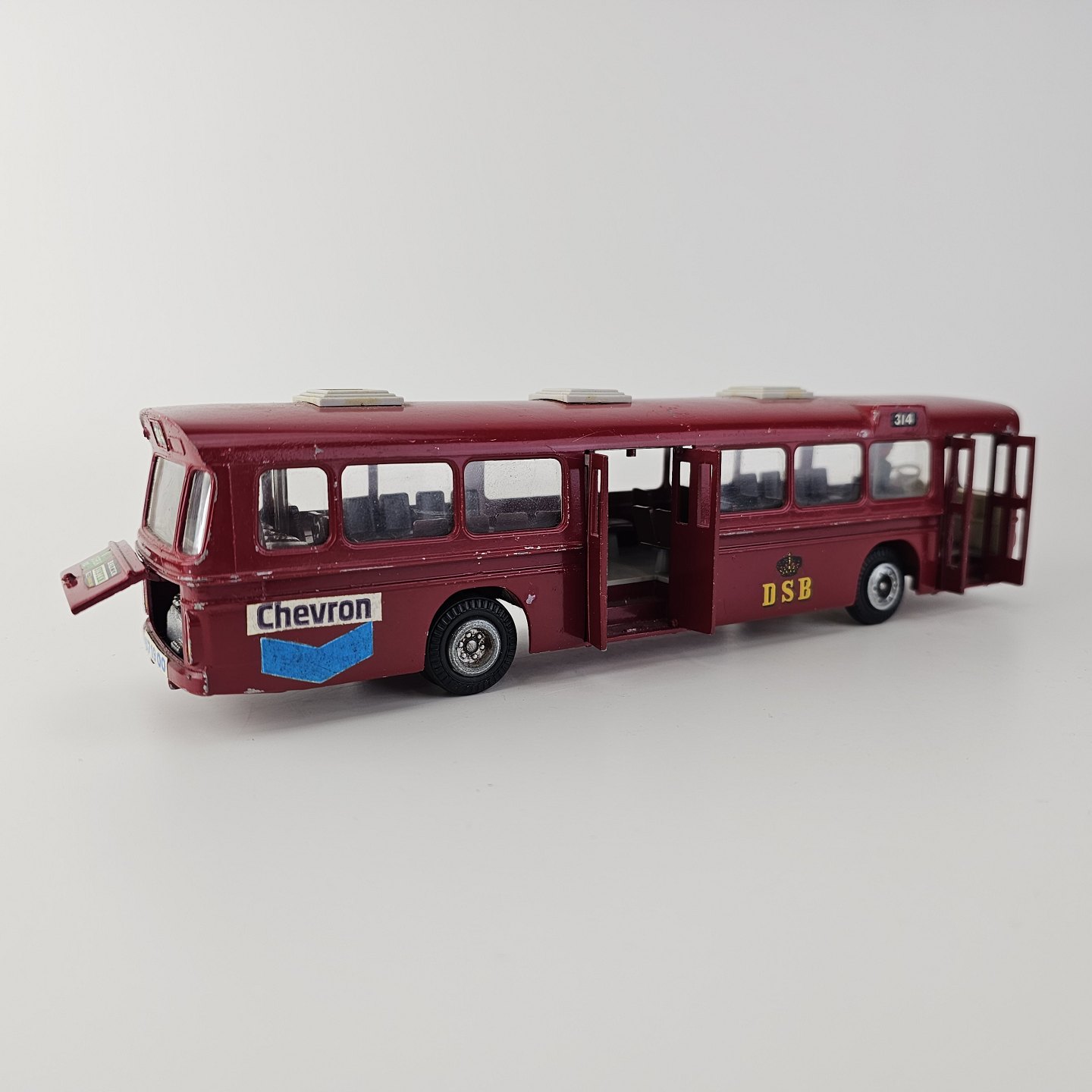 Legetøjsbil. Rødmalet DSB bus, Scania CR-76 med reklamer, chauffør og en baglåge, der kan åbnes
