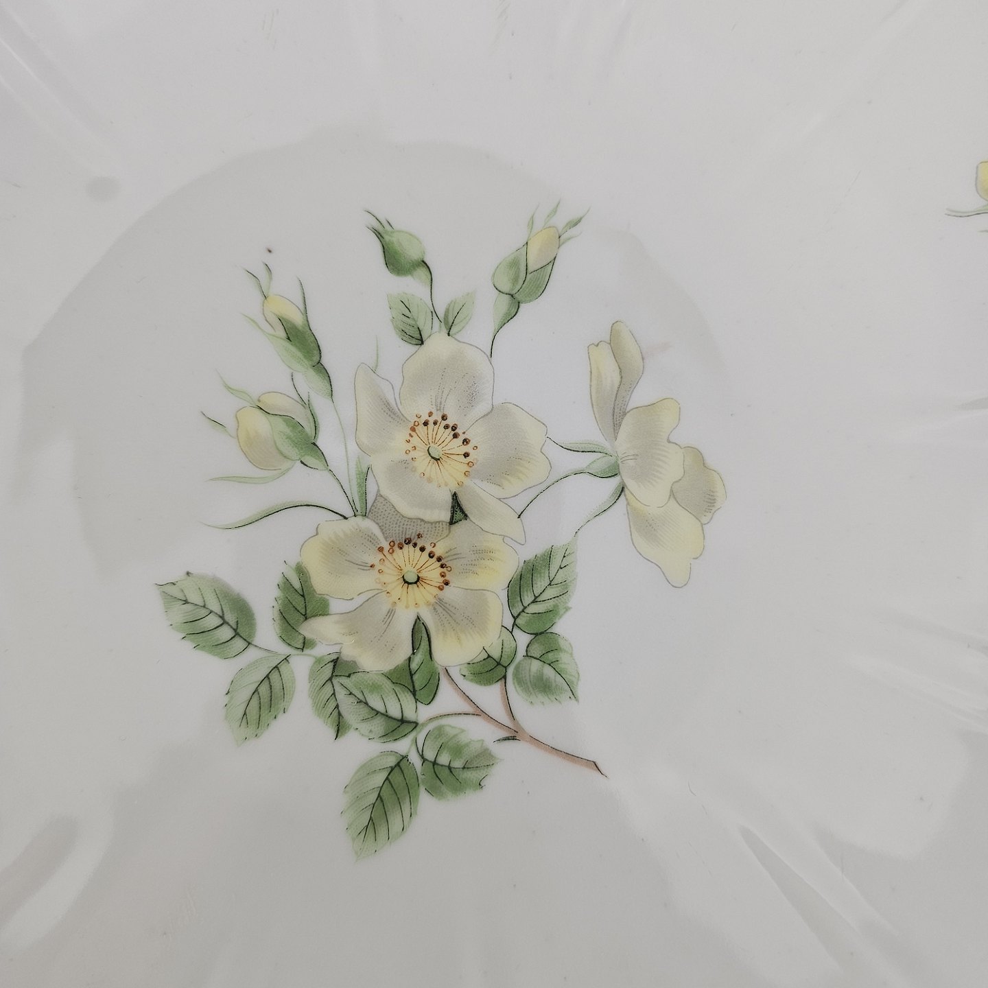 Service i glat hvidt porcelæn med lige knækkede kanter dekoreret med gule blomster og gylden kant