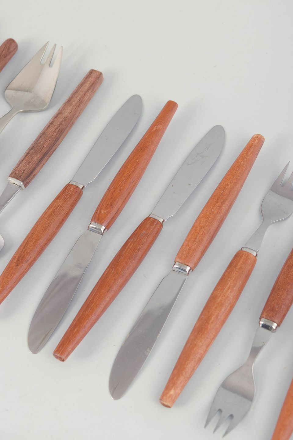 Skandinavisk bestikdesign i 1960’erne var præget af rene linjer og funktionel enkelhed, hvor varme naturmaterialer som træ blev kombineret med rustfrit stål. Udtrykket er tidstypisk modernistisk og velegnet til både daglig brug og borddækning i vintage-stil.