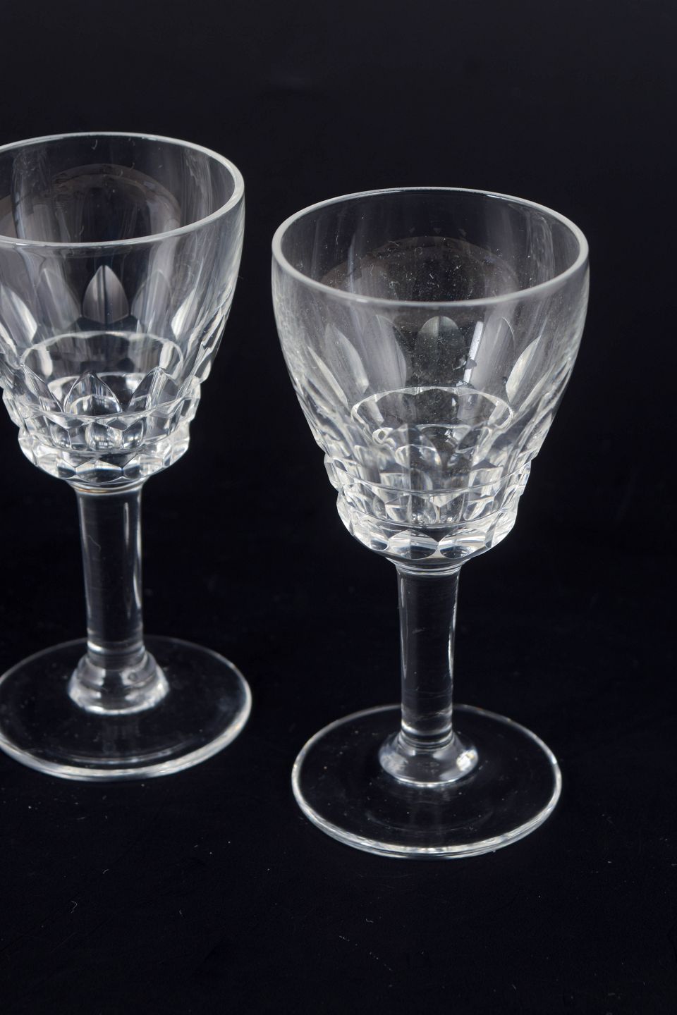 Sæt på fem franske snapseglas i klart krystal med facetteret kumme og klassisk stamme. Form og slibning giver et elegant lysspil og et tidstypisk udtryk fra midten af det 20. århundrede.