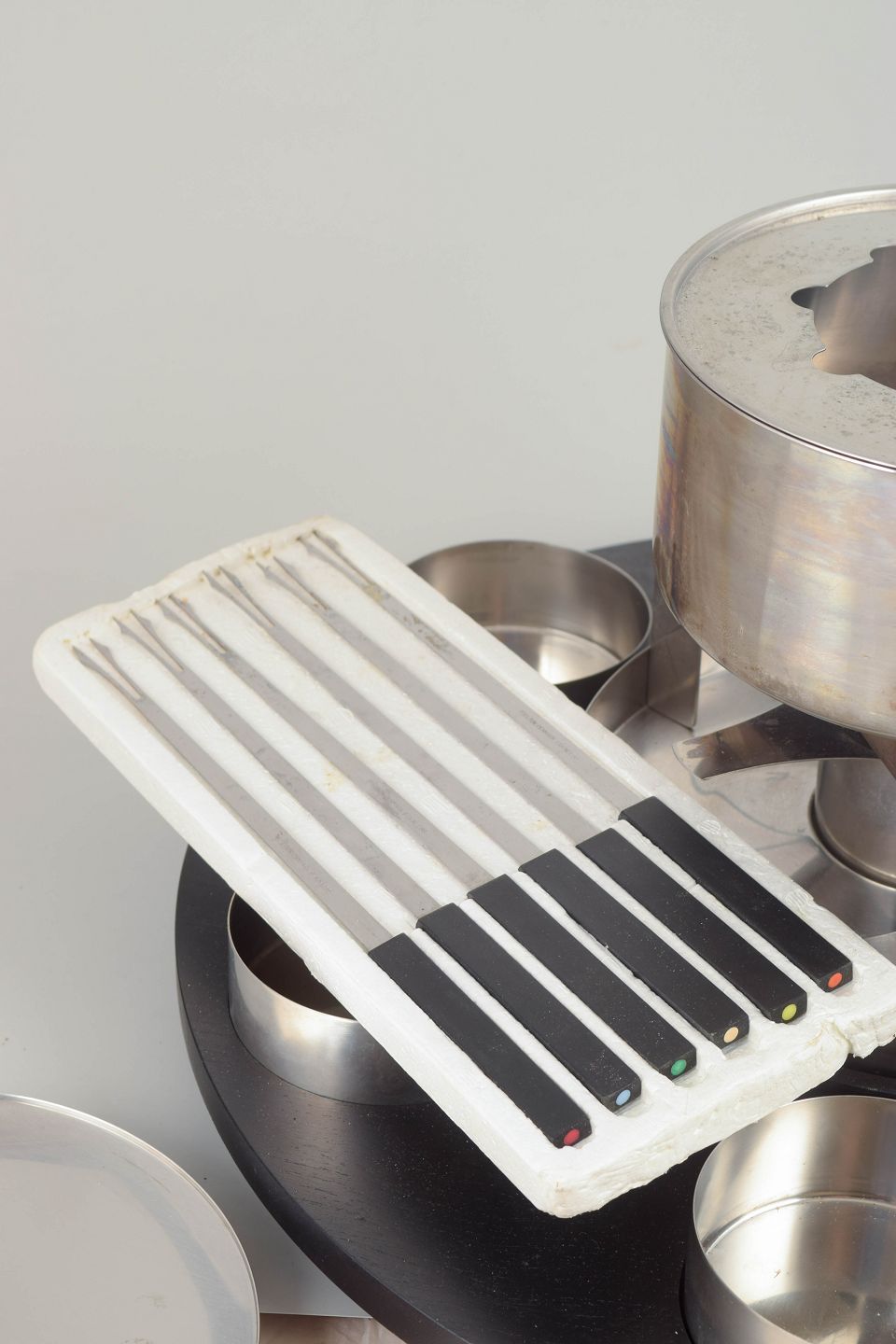 Stort fonduesæt i rustfrit stål med gryde, brænder, sort sokkel og seks skåle og spyd, udført i et stramt funktionalistisk formsprog.