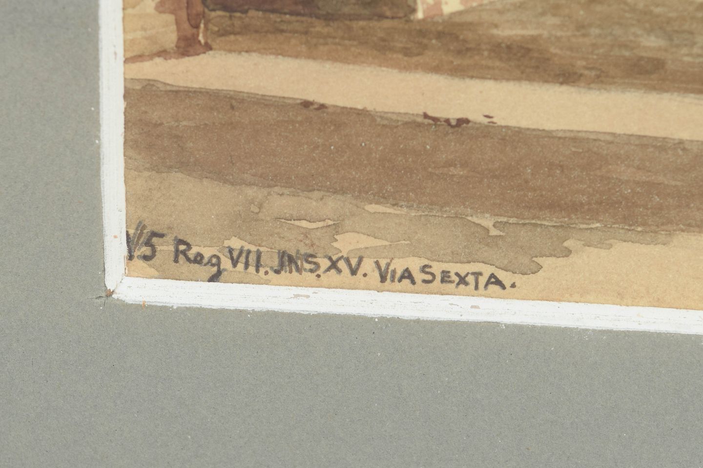 Arkitektonisk motiv fra Pompeji med klassiske bygningsfragmenter og rumlige perspektiver, udført som akvarel i dæmpede jordfarver og varme okkertoner. Signeret og dateret Pompeji 1905.
