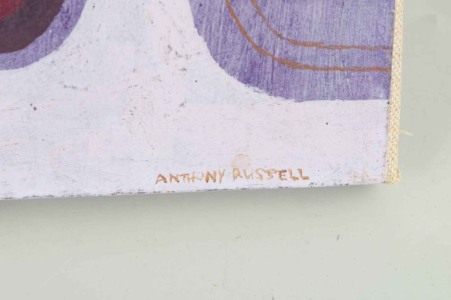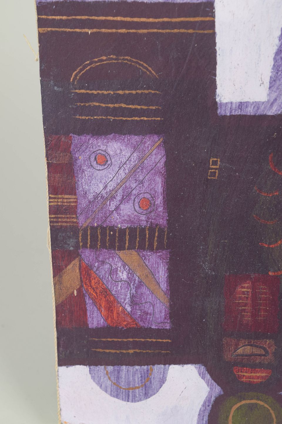 Abstrakt og maleriinspireret komposition med geometriske og organiske former i dæmpede lilla, brune og jordfarvede nuancer, udført i blandteknik og signeret.