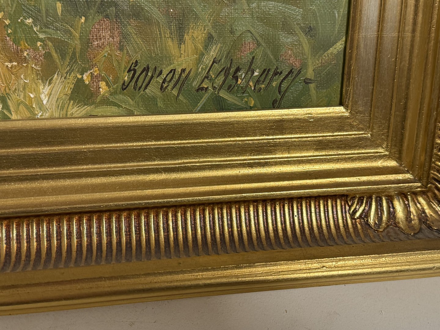 Søren Edsberg (f. 1945 ), Oliemaleri på lærred med motiv fra landet, Mål med ramme: 53x43cm, lille fejl på rammen ellers pæn stand
