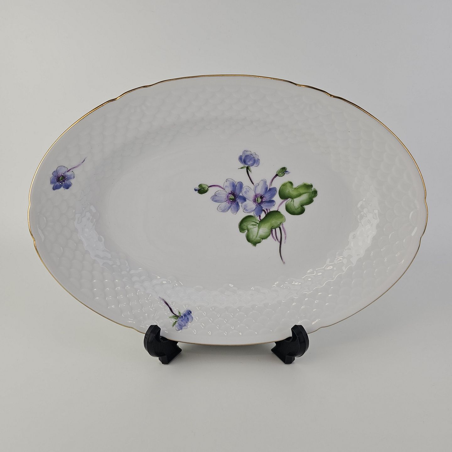 Antonius er af hvidt porcelæn med skælform dekoreret med håndmalede blå anemoner og guldkant. Også kendt under navnet Blå Anemone.