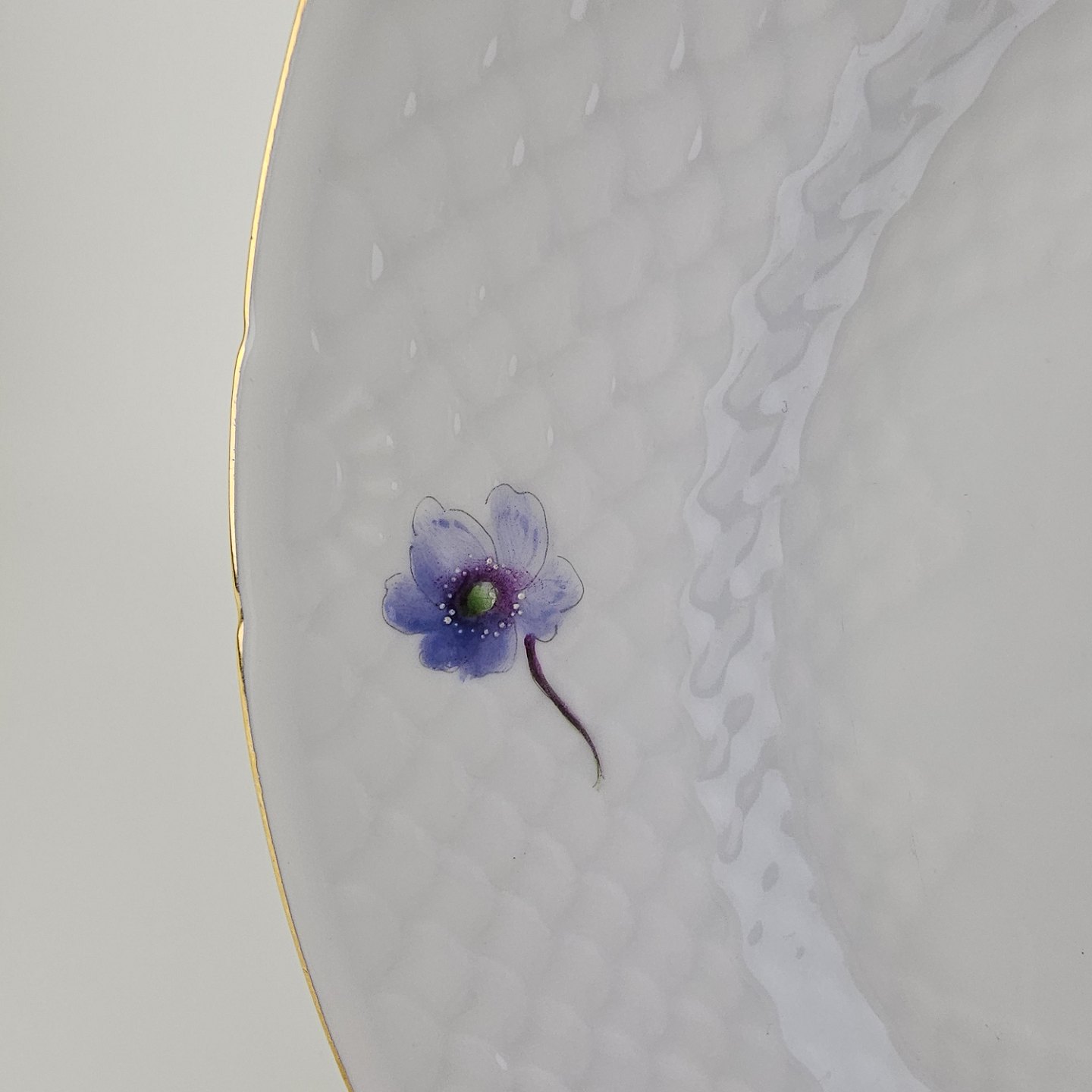 Antonius er af hvidt porcelæn med skælform dekoreret med håndmalede blå anemoner og guldkant. Også kendt under navnet Blå Anemone.