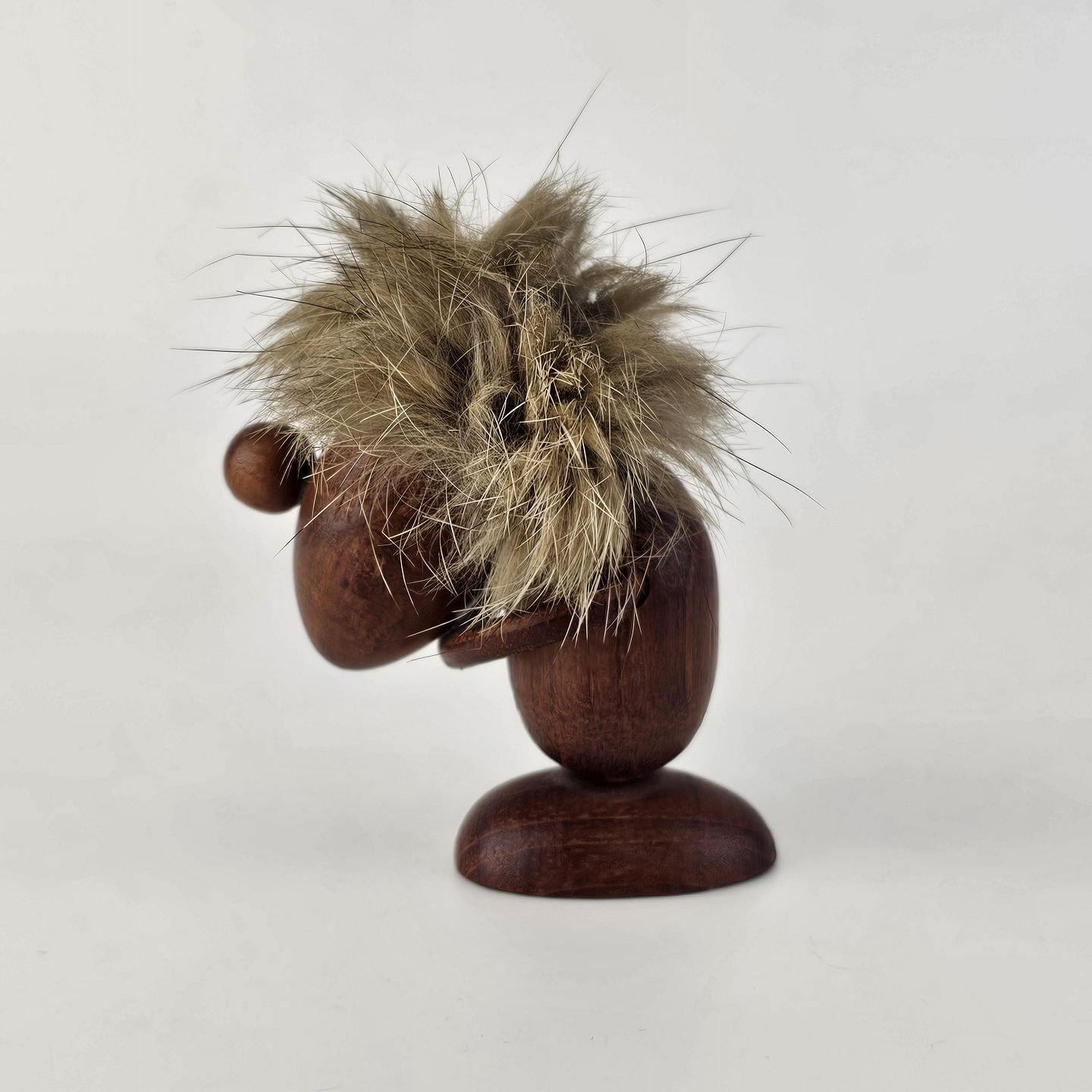 Håndskåret figur af teak med støvet blond hår og arme af læder. Fra 1960'erne