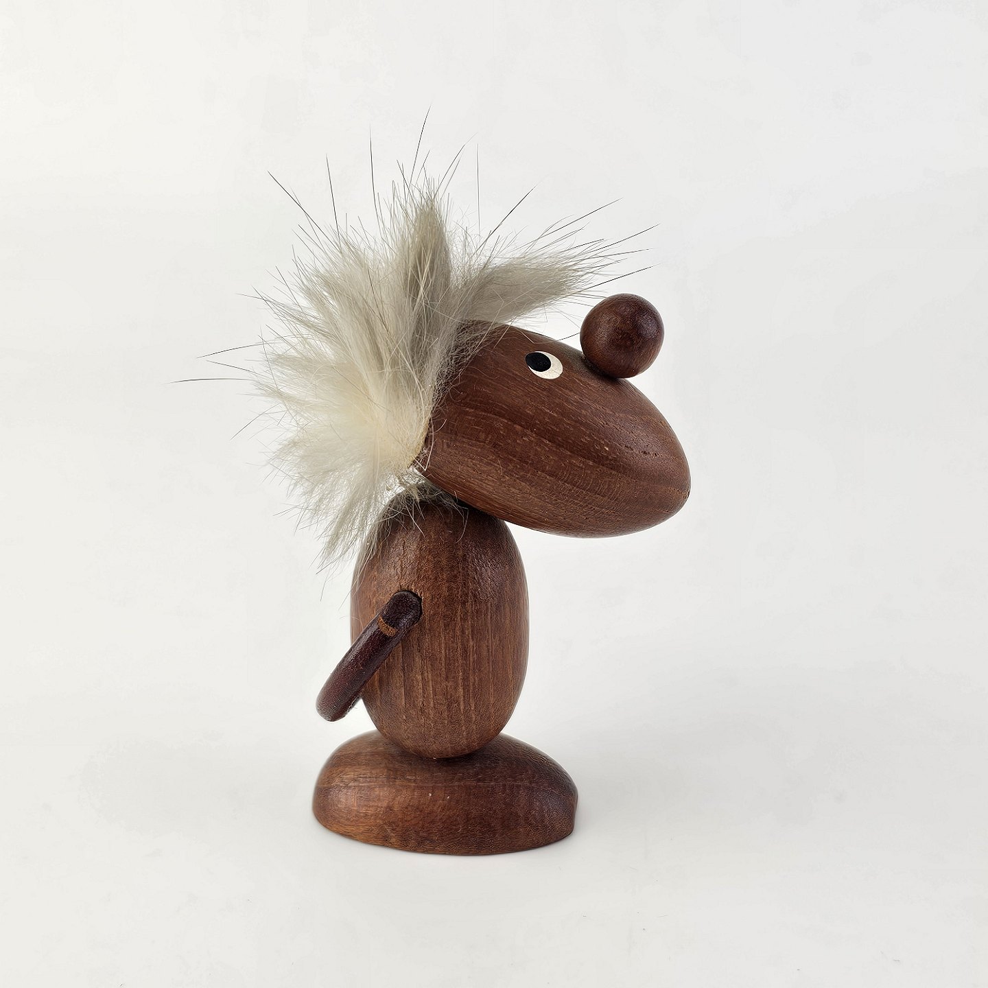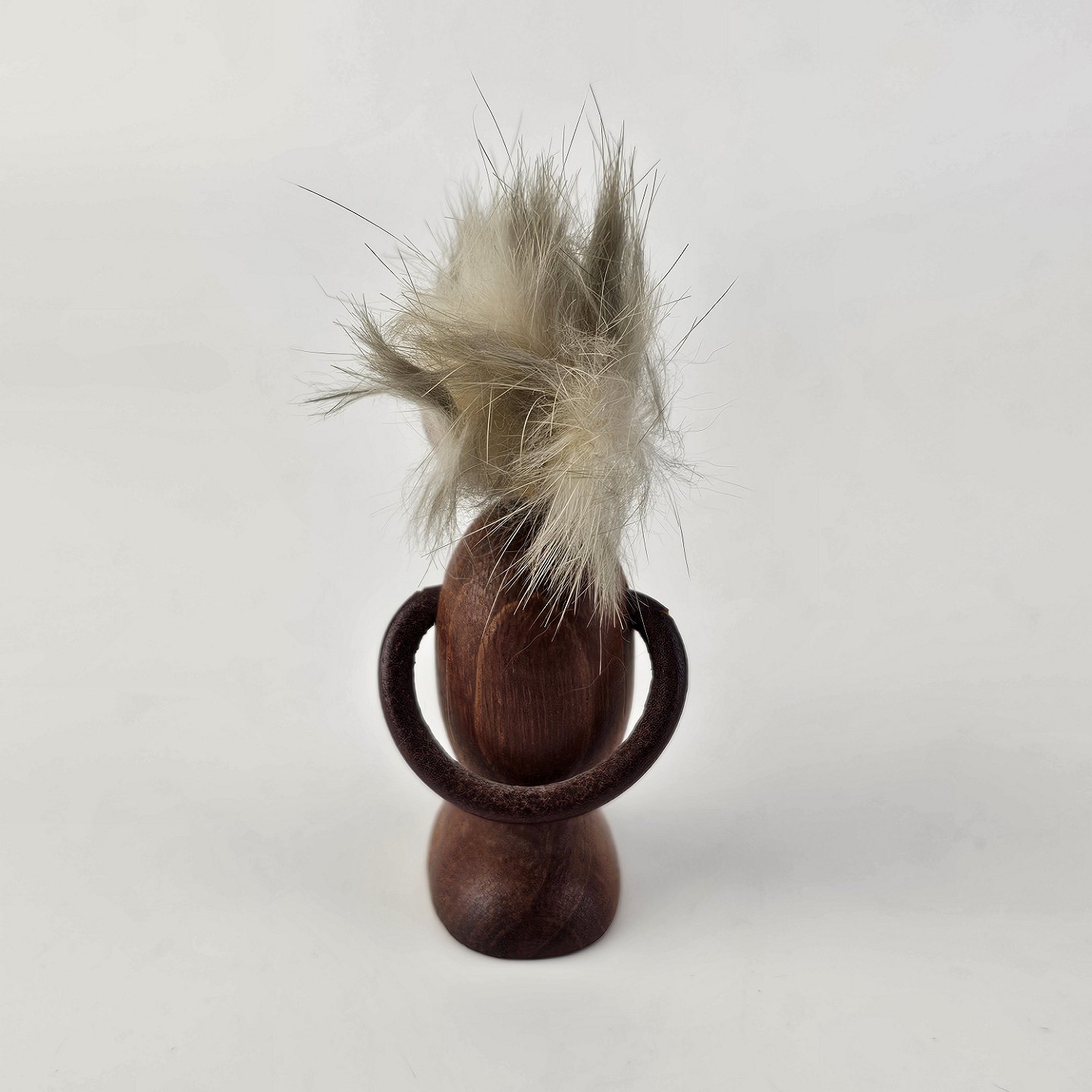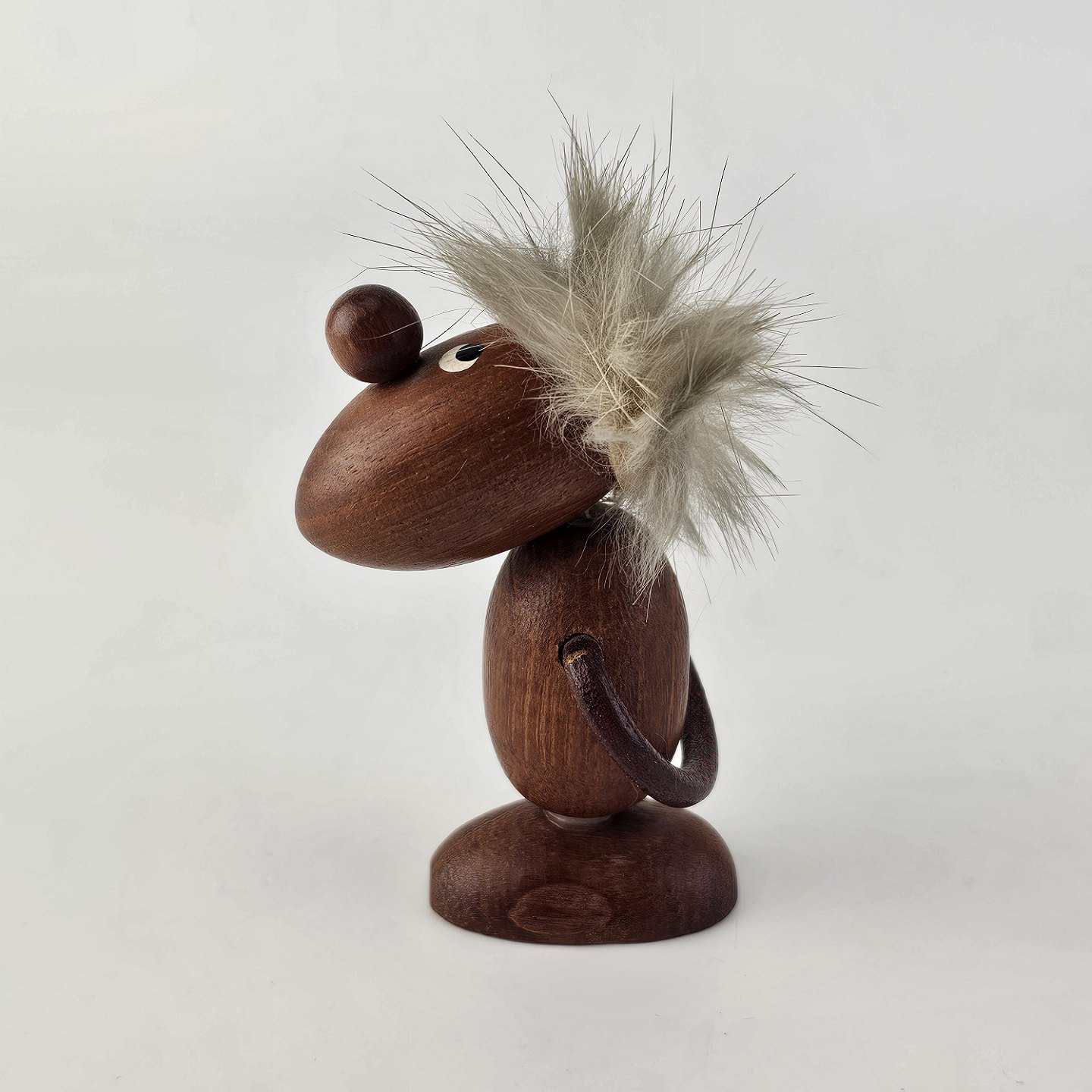 Håndskåret figur af teak med gråt hår og arme af læder. Fra 1960'erne