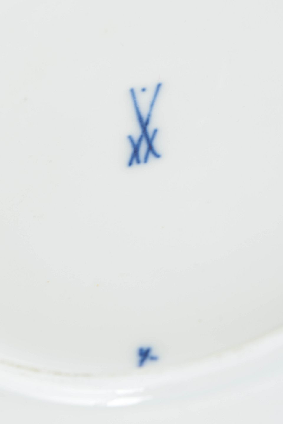 Dybe tallerkener i hvidt porcelæn dekoreret i underglasurblåt løgmønster med bølget fane. Mærket i bunden med Meissens krydsede sværd.