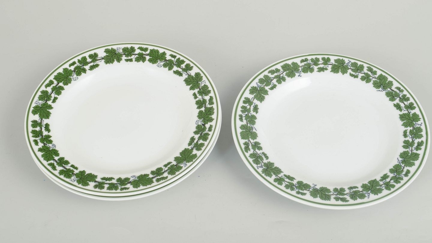 Runde porcelænstallerkener dekoreret med grøn vinløvsbort langs kanten. Første sortering, mærket med Meissen krydsede sværd.