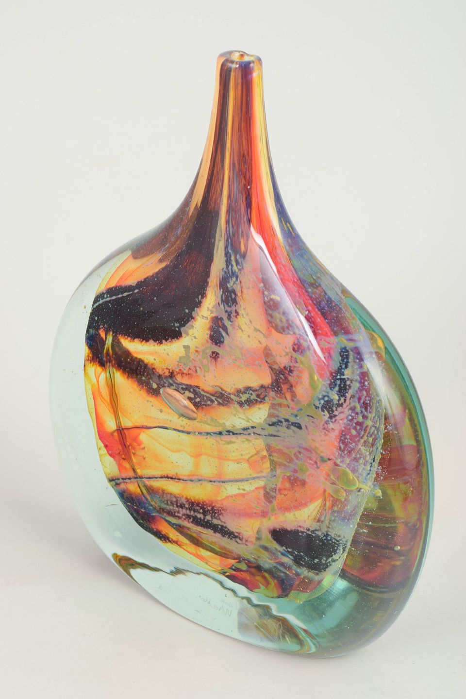 Organisk formet kunstglasvase i kraftigt, mundblæst glas med indkapslede, hvirvlende farver i rav, orange og mørke kontraster, afsluttet med klart ydre lag. Frit opbygget, asymmetrisk form med markant tyngde i bunden. Signeret under bunden Mdina glass, Malta”.