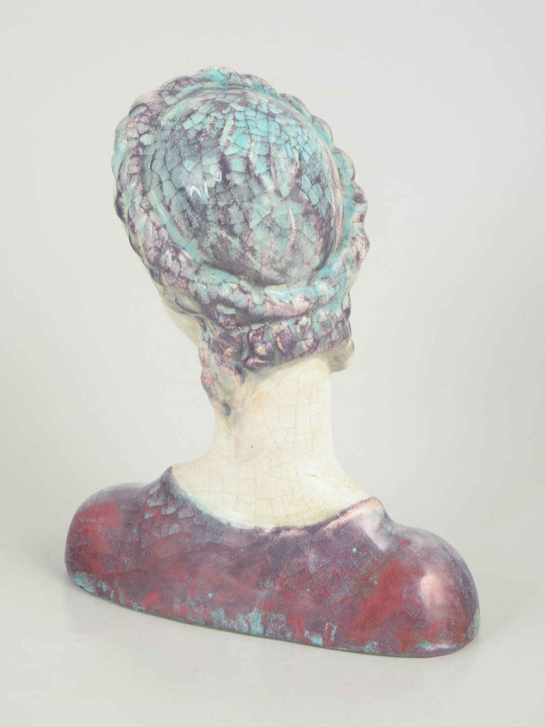 Elegant kvindebuste i stentøj udført i Art Deco-inspireret stil med stiliseret hår og let nedadbøjet hoved. Glaseret i dæmpede, krakelerede nuancer af creme, violet og turkis. Fremstillet på Bornholm og stemplet under bunden med værkets ovale M.A.&S.-mærke.