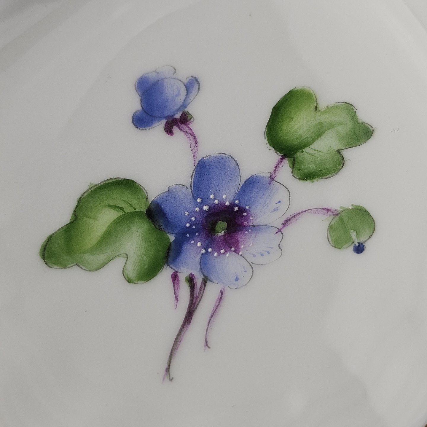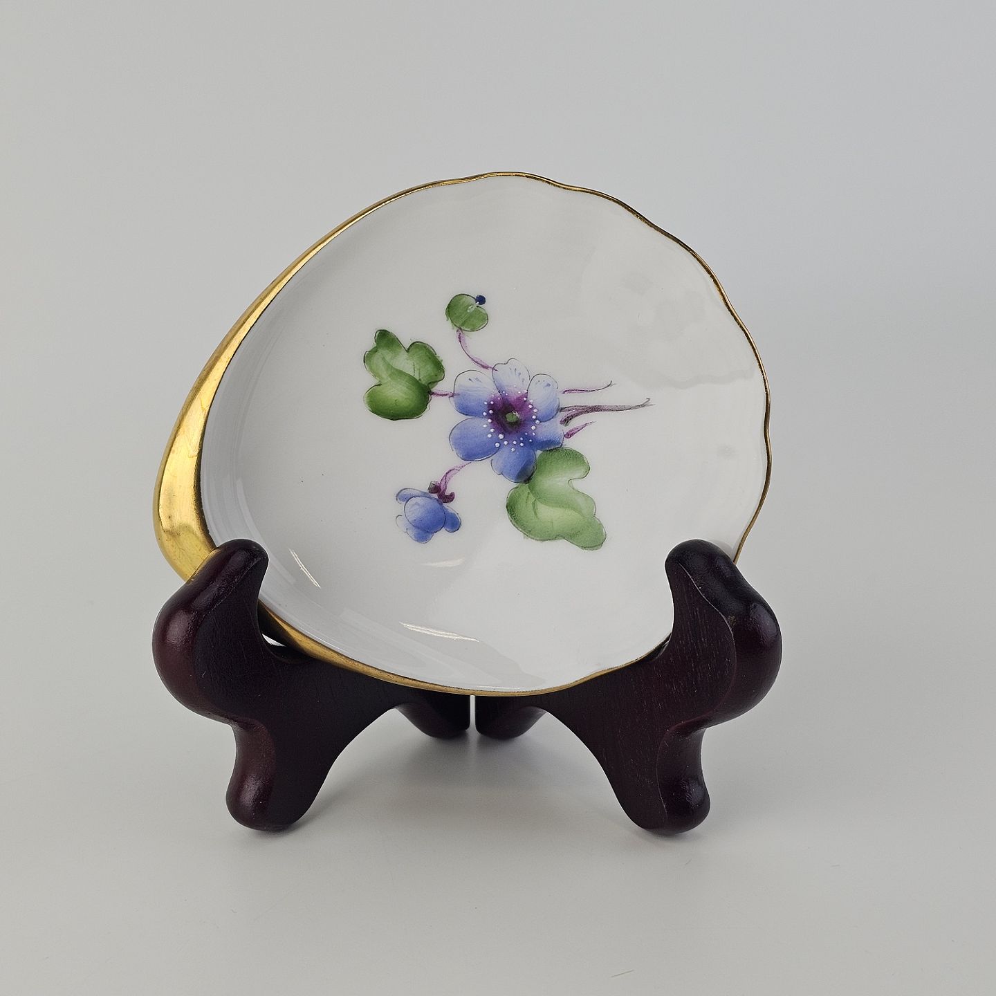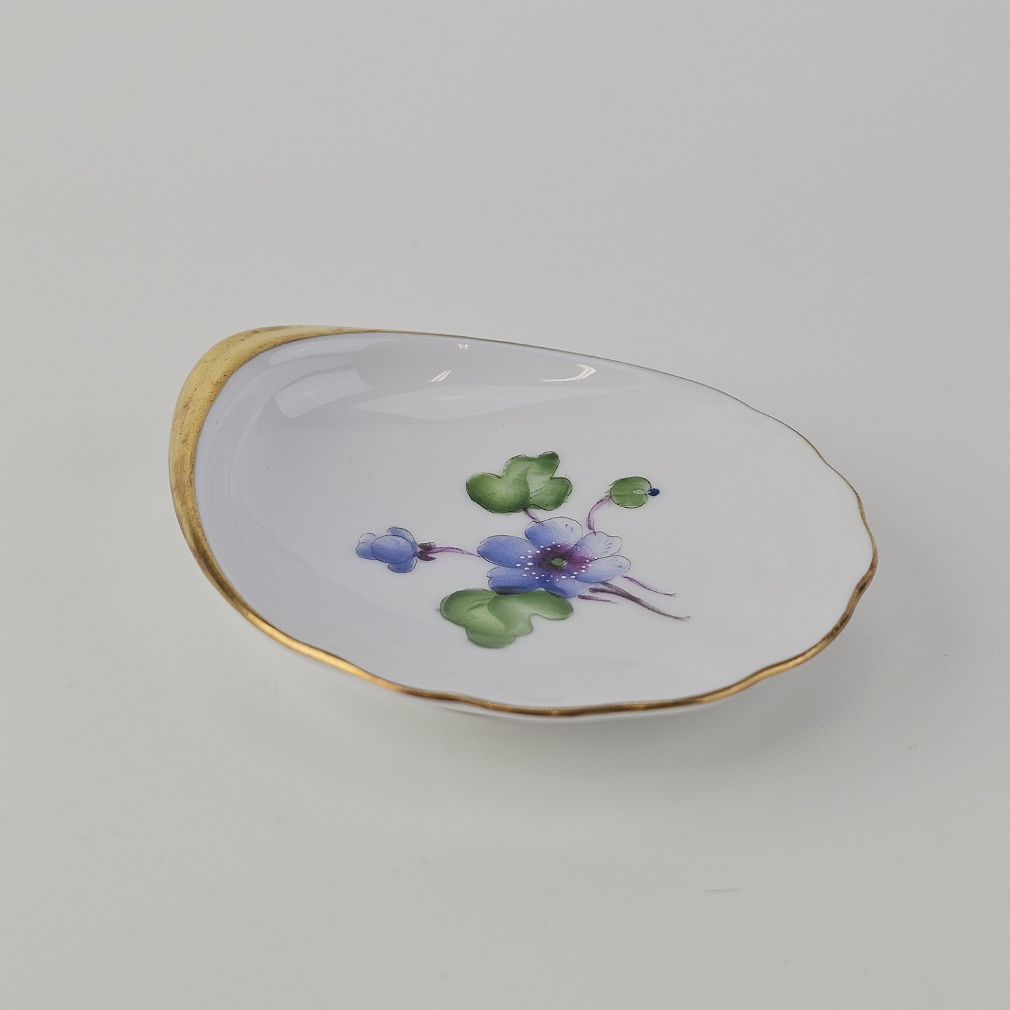Antonius er af hvidt porcelæn med skælform dekoreret med håndmalede blå anemoner og guldkant. Også kendt under navnet Blå Anemone.