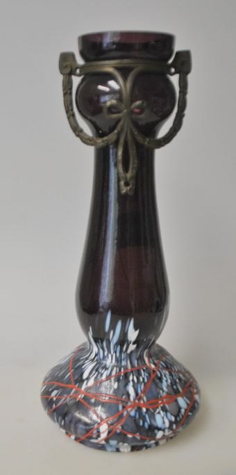 Jugend vase, ca. 1900, Tyskland. Violet glas med fod af hvidt, blåt og gråt glas. Ovenover rødt glas linie. Foroven monteret med bronze dekoration. H.: 25,2 cm.