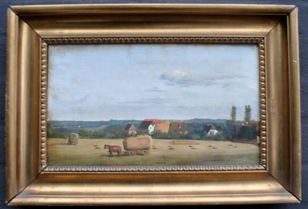 Rademacher, Niels Grønbek (1812 - 1885) Danmark: Høstscene fra en sjællandsk herregård. Olie på lærred. Svagt signeret. 19 x 32,5 cm.