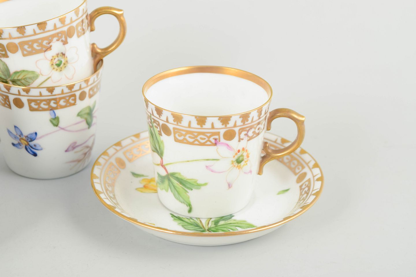 Porcelæn i Flora Danica-stil med håndmalede botaniske motiver og forgyldt kant.