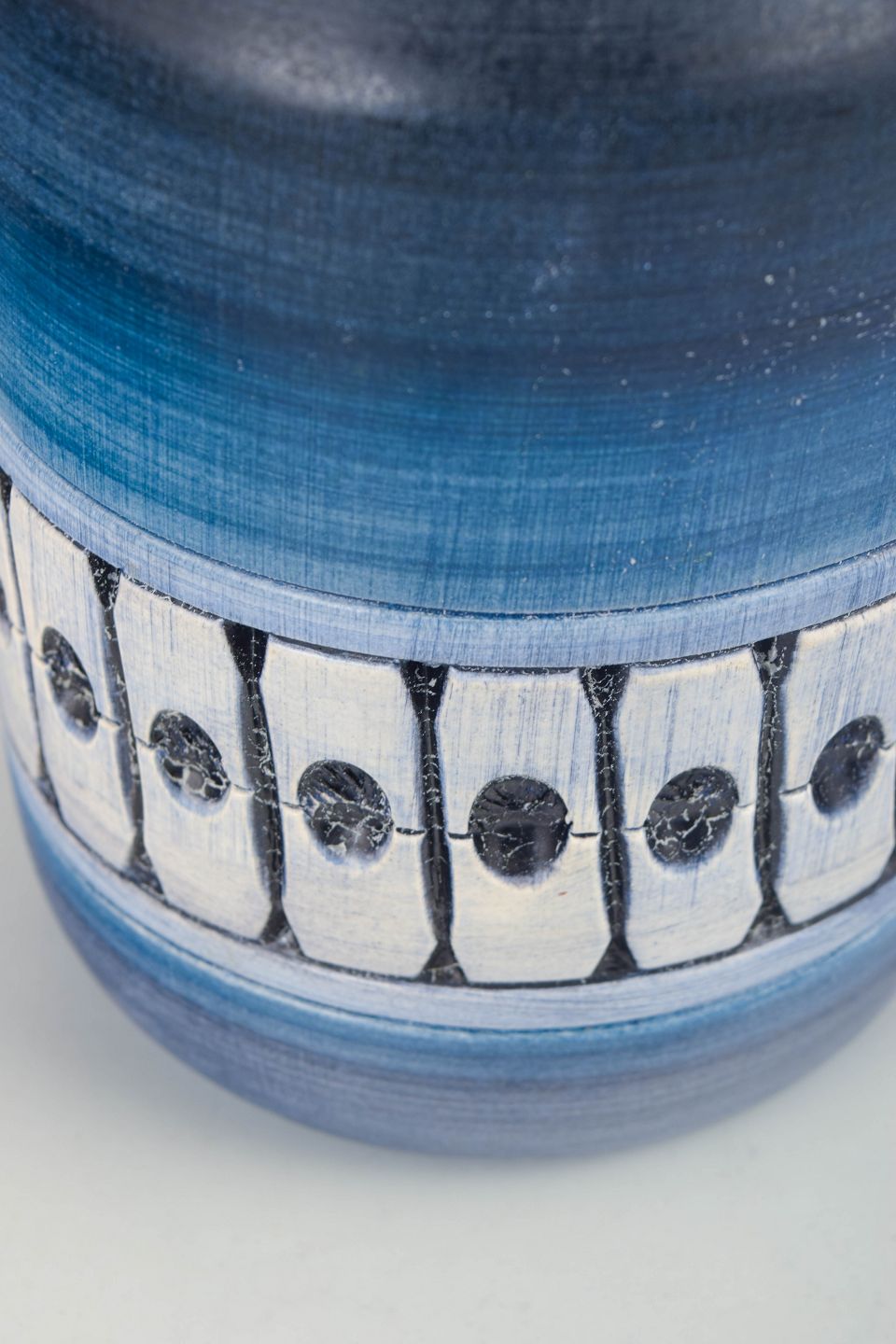 Cylindrisk vase i drejet stentøj med blå glasur i nuancer fra dyb kobolt til lysere blå toner, dekoreret med et grafisk bånd i sort og hvidt. Original mærkat under bunden.