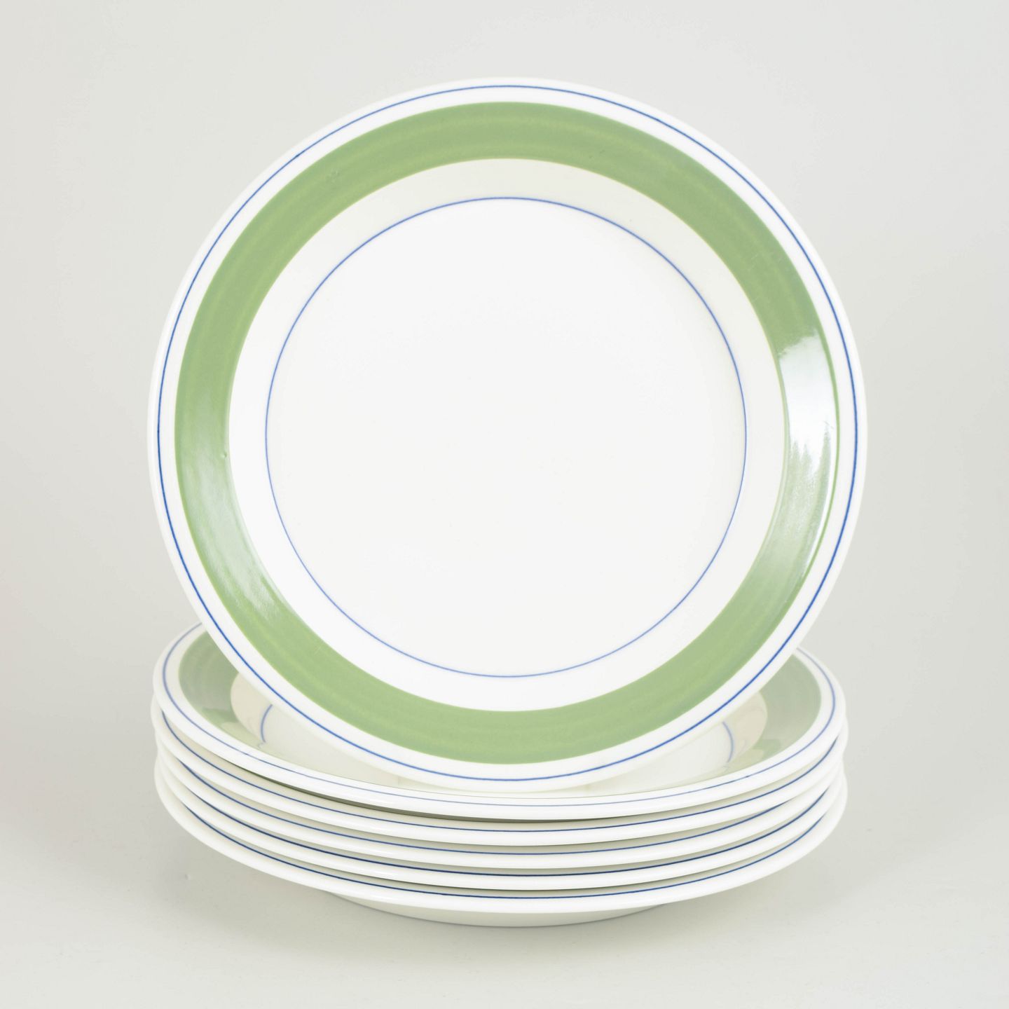 Sæt med 6 middagstallerkener dekoreret med det karakteristiske “Krokus”-mønster i grønne nuancer med fine blå cirkellinjer placeret langs fanen.