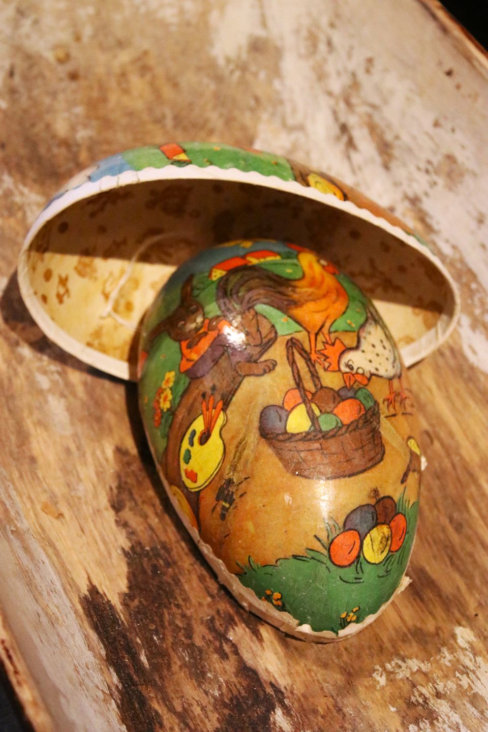 Gammelt vintage påskeæg i papmache med motiv af påskehare og høns der samler påskeæg...