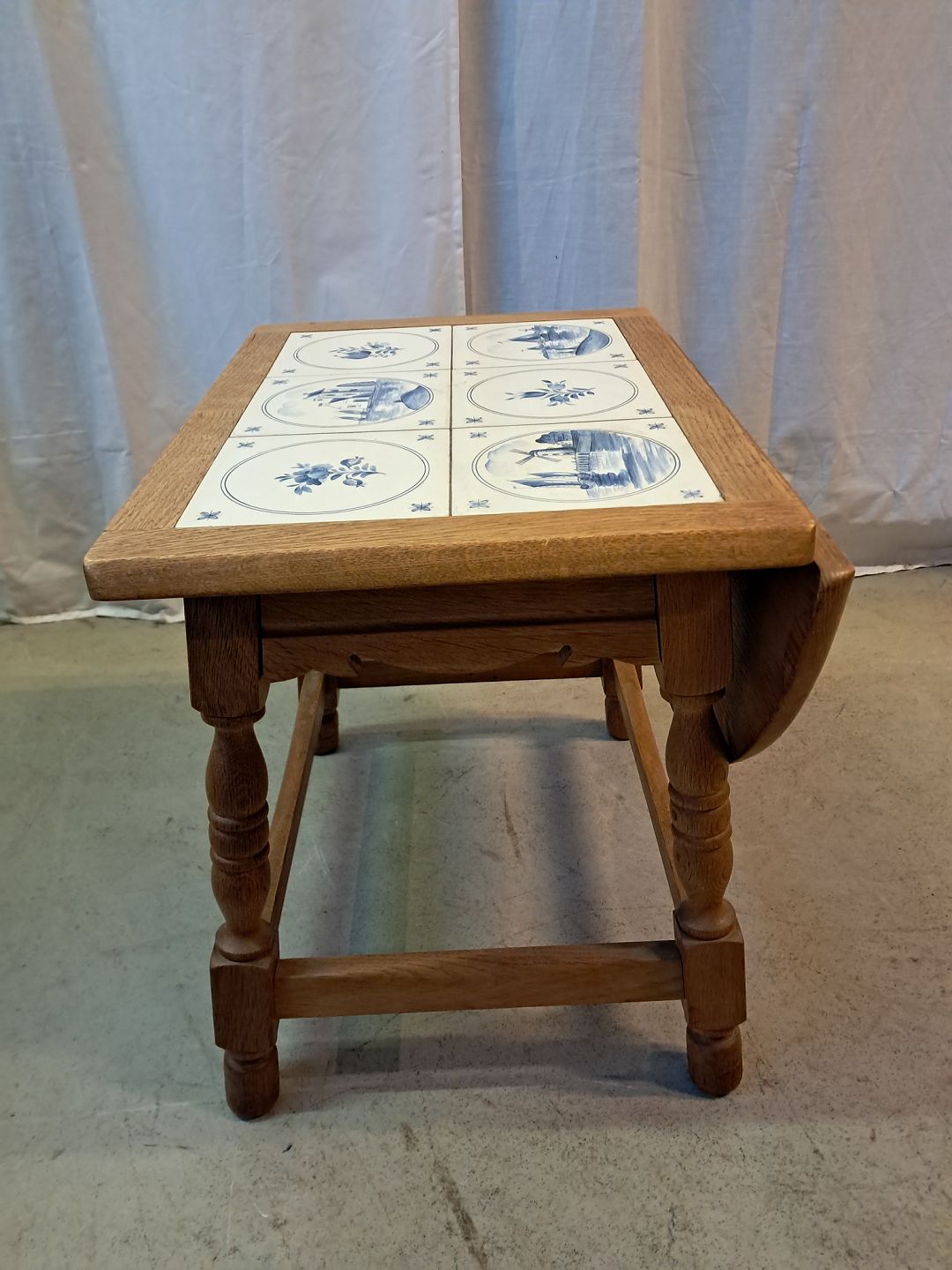 Lille bord i massivt egetræ med kakler og en klap, fra 1980erne.