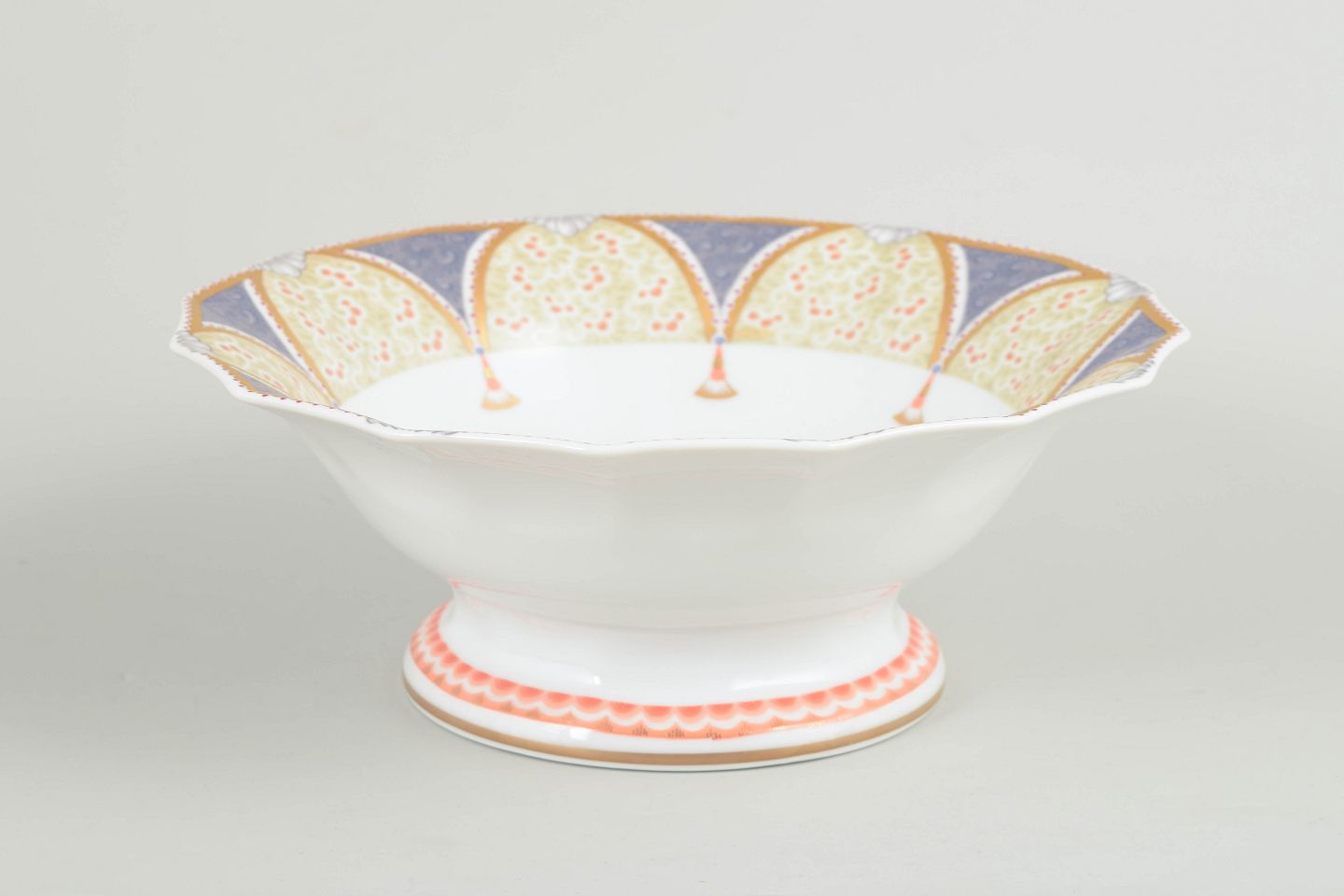 Stor opsats i hvidt porcelæn med fod, dekoreret med Fairytale-mønster i bløde rosa, gyldne og blå toner langs kanten. Fremstillet i perioden 1992–1999 i 1. sortering. Model 577.