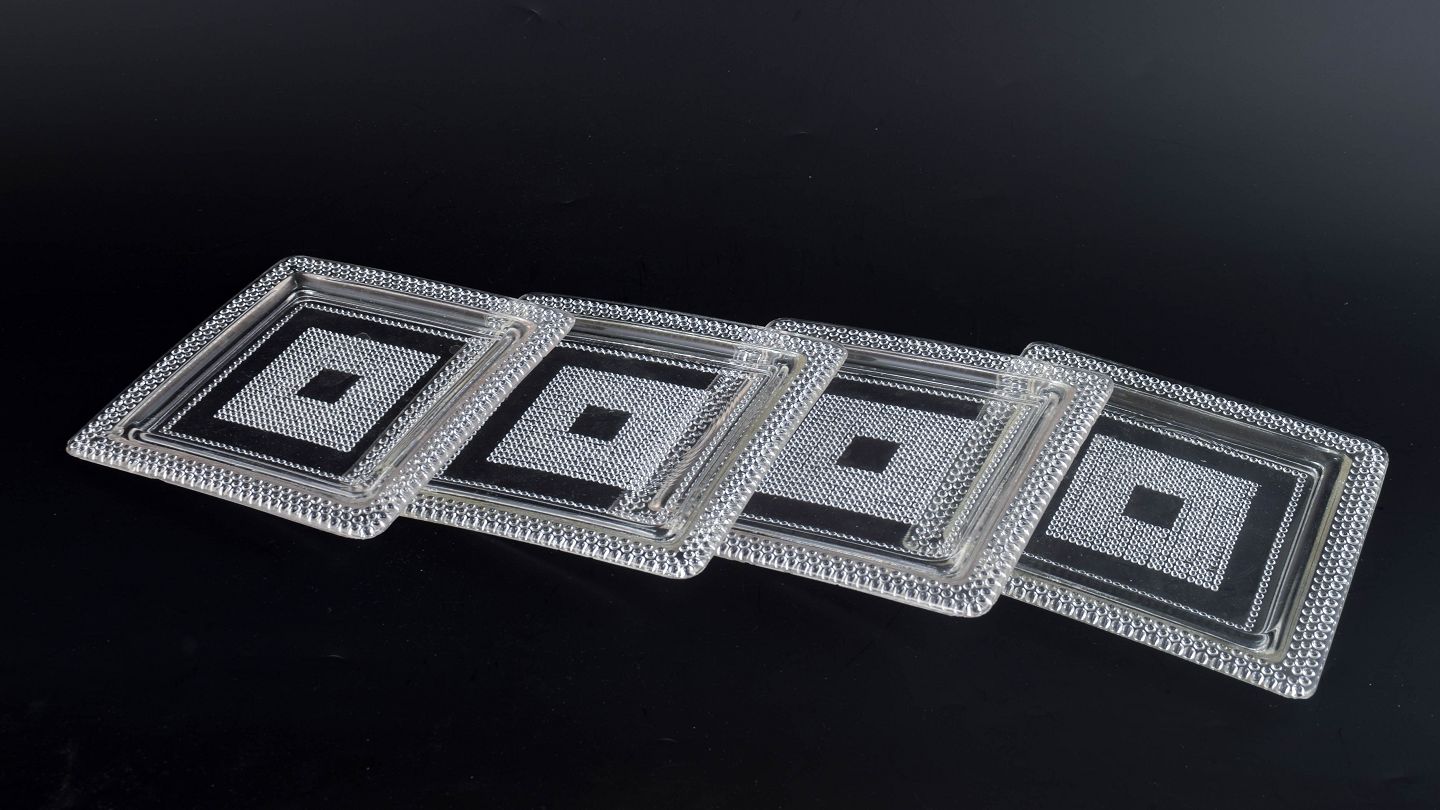 Sæt på fire kvadratiske tallerkener i klart kunstglas med geometrisk relief og markeret midterfelt. Fremstillet i presset glas.