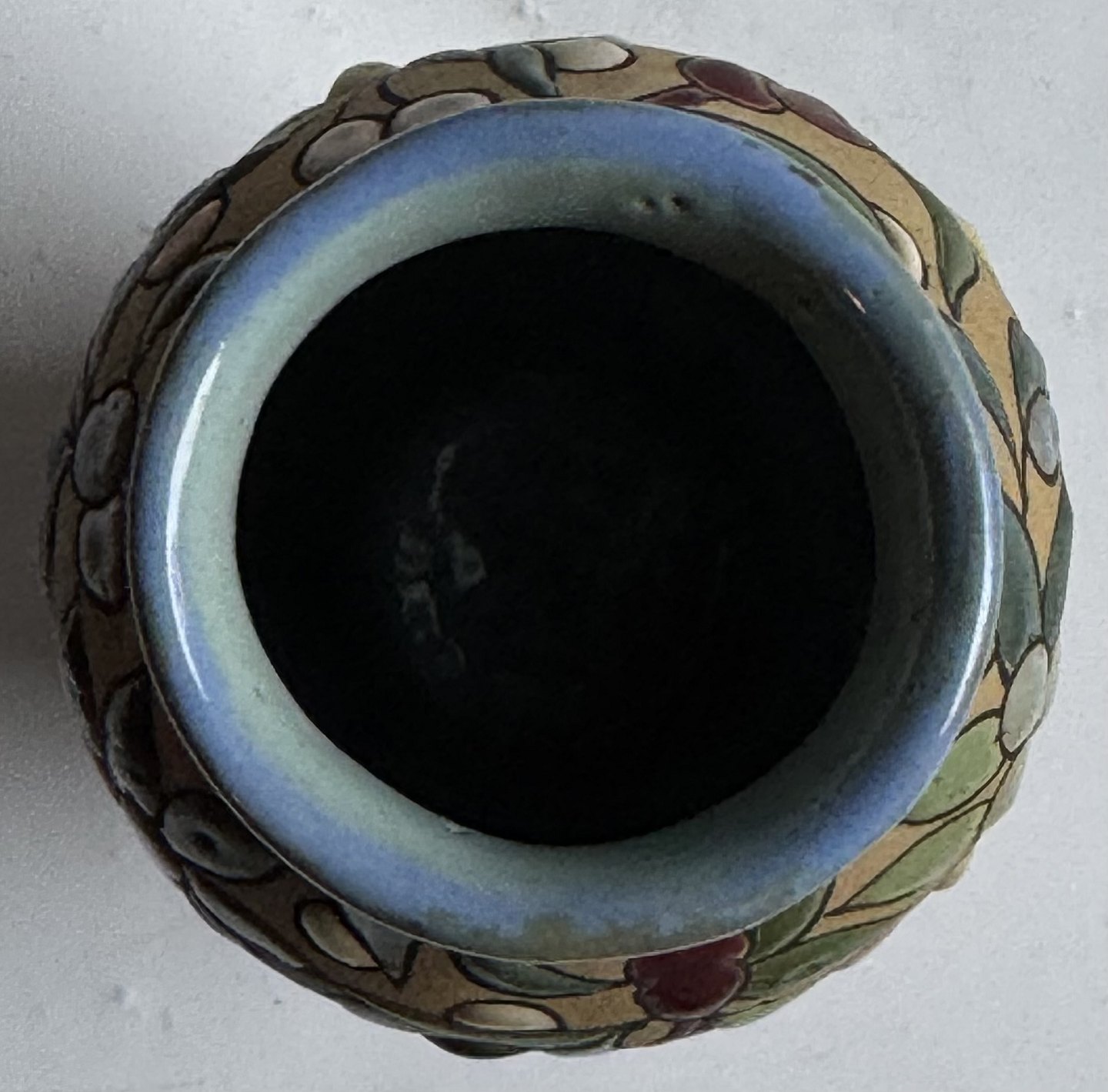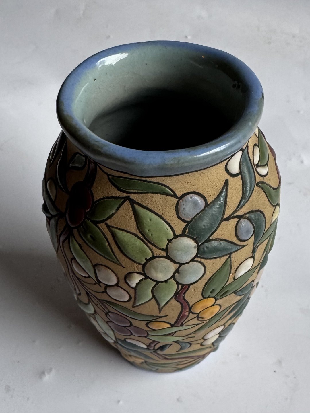 Arguado Toledo vase i keramik med farverig emalje blad og bær dekoration rundt om vasen. Grundlæggeren af dette produkt José Aguado Villalba (1919-2007) havde en mangeårig produktion af keramik i lignende stil fra midten af 1960’erne til i slutningen af 1980’erne i Toledo i Spanien. Vasen er 10,7 cm høj.