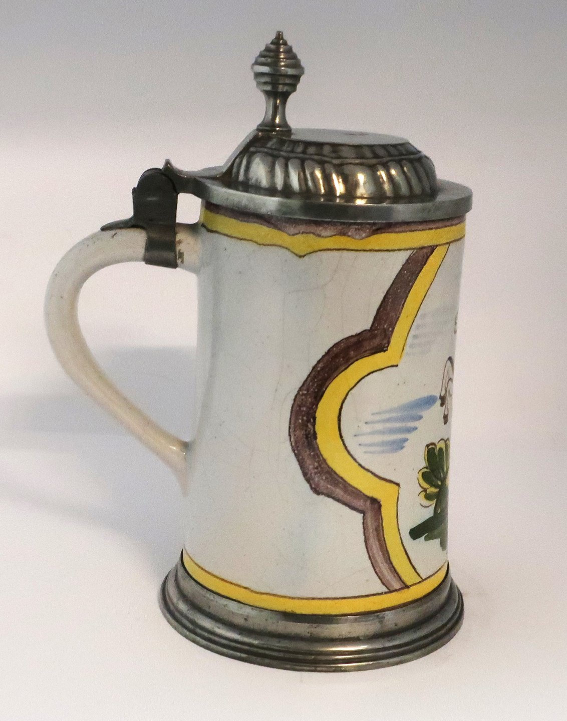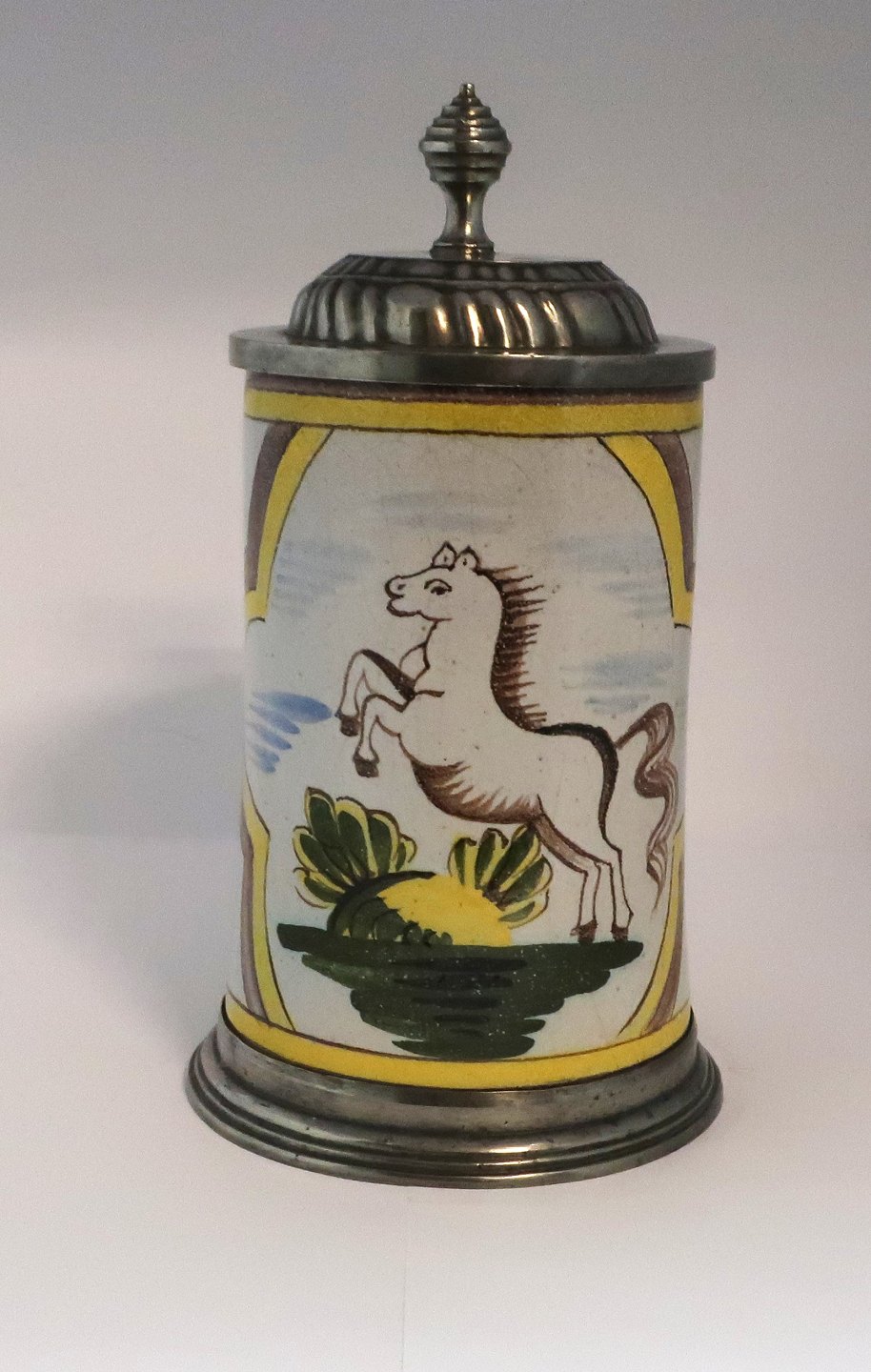 Kellinghusen. Krus af fajance med tin låg. Dekoreret med en springende hest. Højde 23 cm