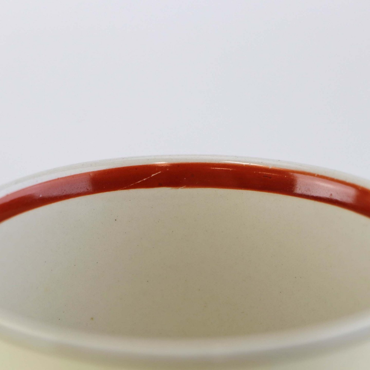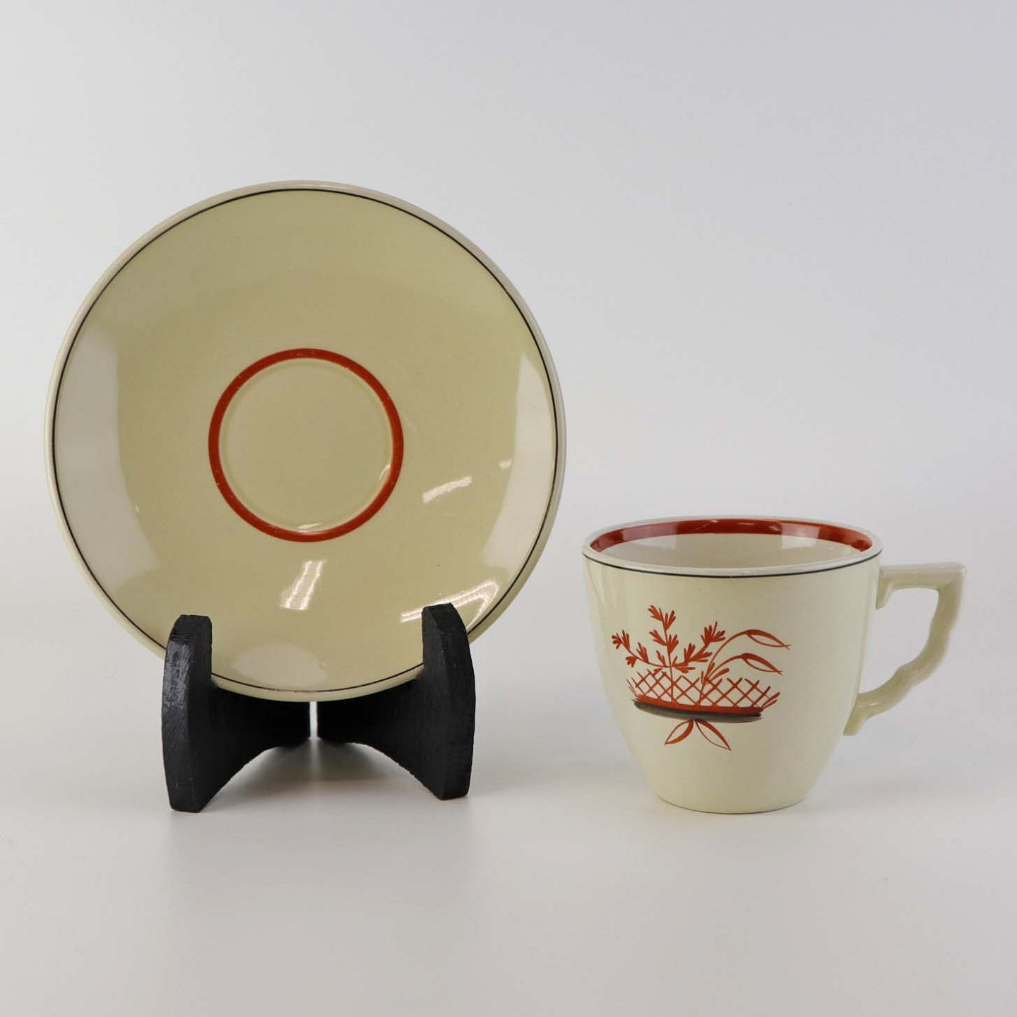 Fajancestel med dekoration af blomsterkurv på gullig baggrund med orangerød kant stribe.