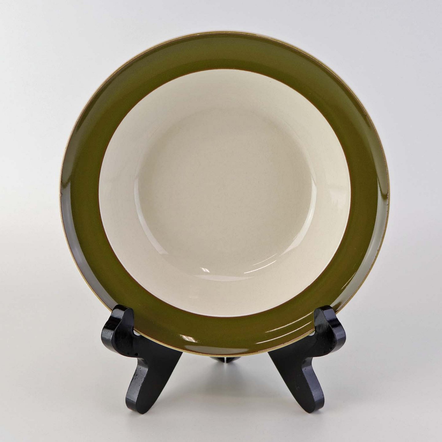 Flaskegrøn fajancestel i Prunella stelform med inderside i hvid glasur og tynd rød kant stribe.