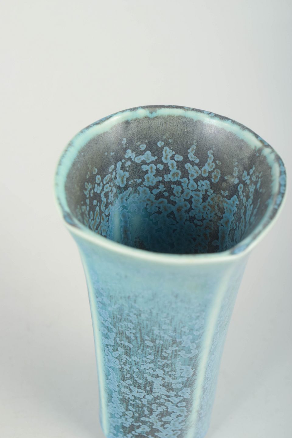 Elegant, høj vase i drejet stentøj med smukt løbende krystalglasur i lyse blå og turkise nuancer. Formen er slank med let udadbøjet rand. Stemplet Gustavsberg Selecta samt signeret BF under bunden.