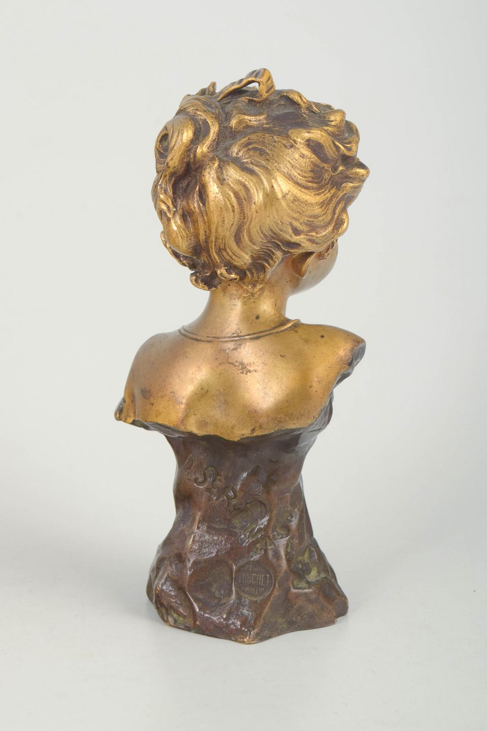 Figurativ buste i massivt bronze forestillende ung pige med let drejet hoved og blødt modellerede ansigtstræk. Støbt hos Louchet, Paris, i 1890’erne.