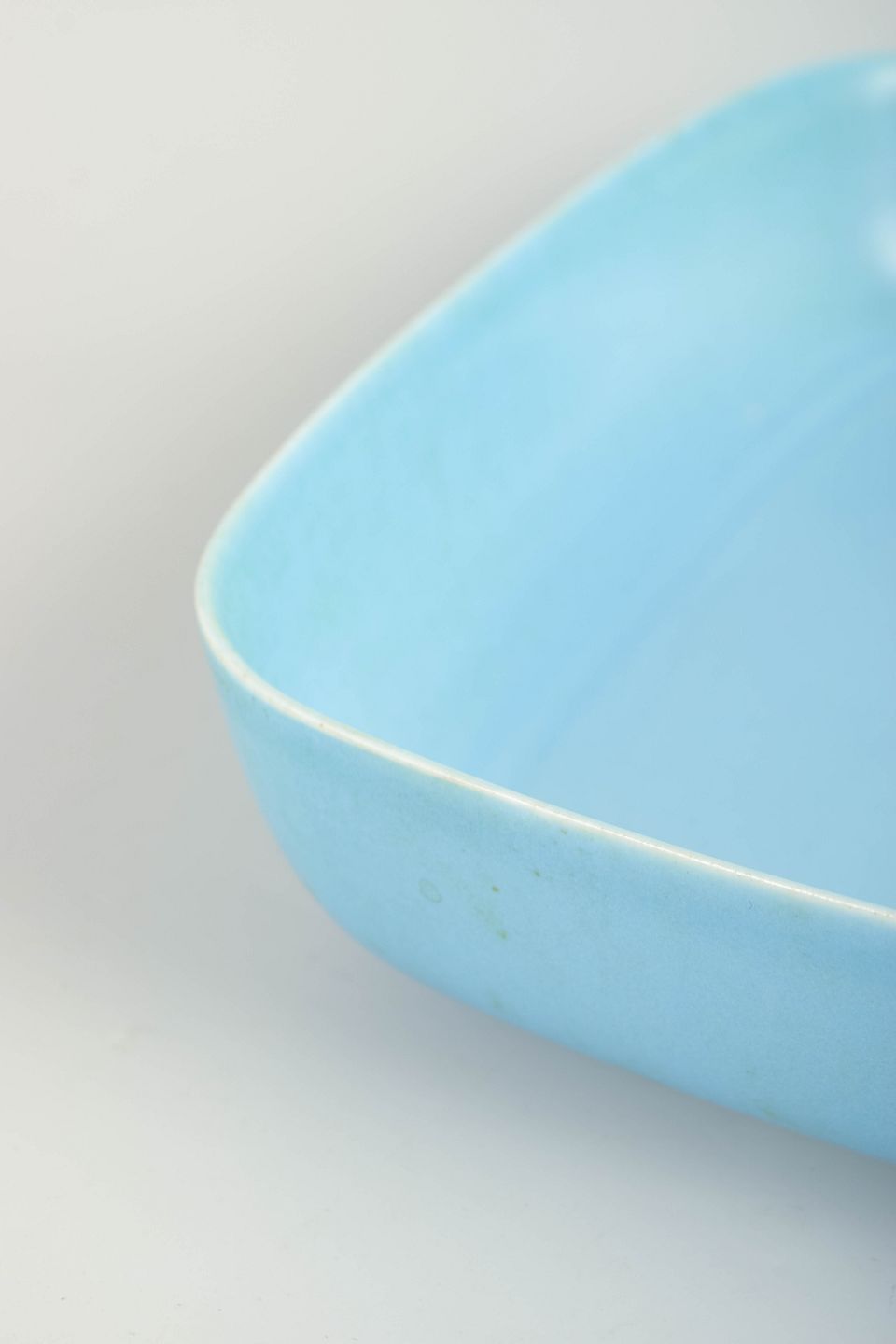 Kvadratisk skål i stentøj med afrundede hjørner og ensartet turkis glasur.