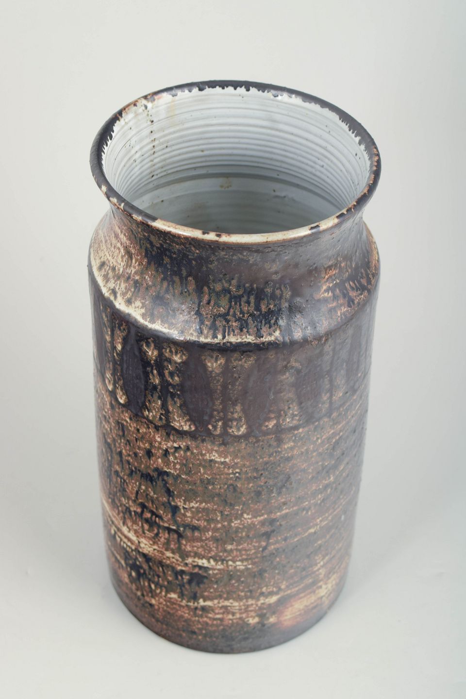 Cylindrical stoneware vase with a slightly constricted neck and defined rim. The surface features deep brown and black tones with a metallic sheen and pronounced vertical and horizontal glaze effects.