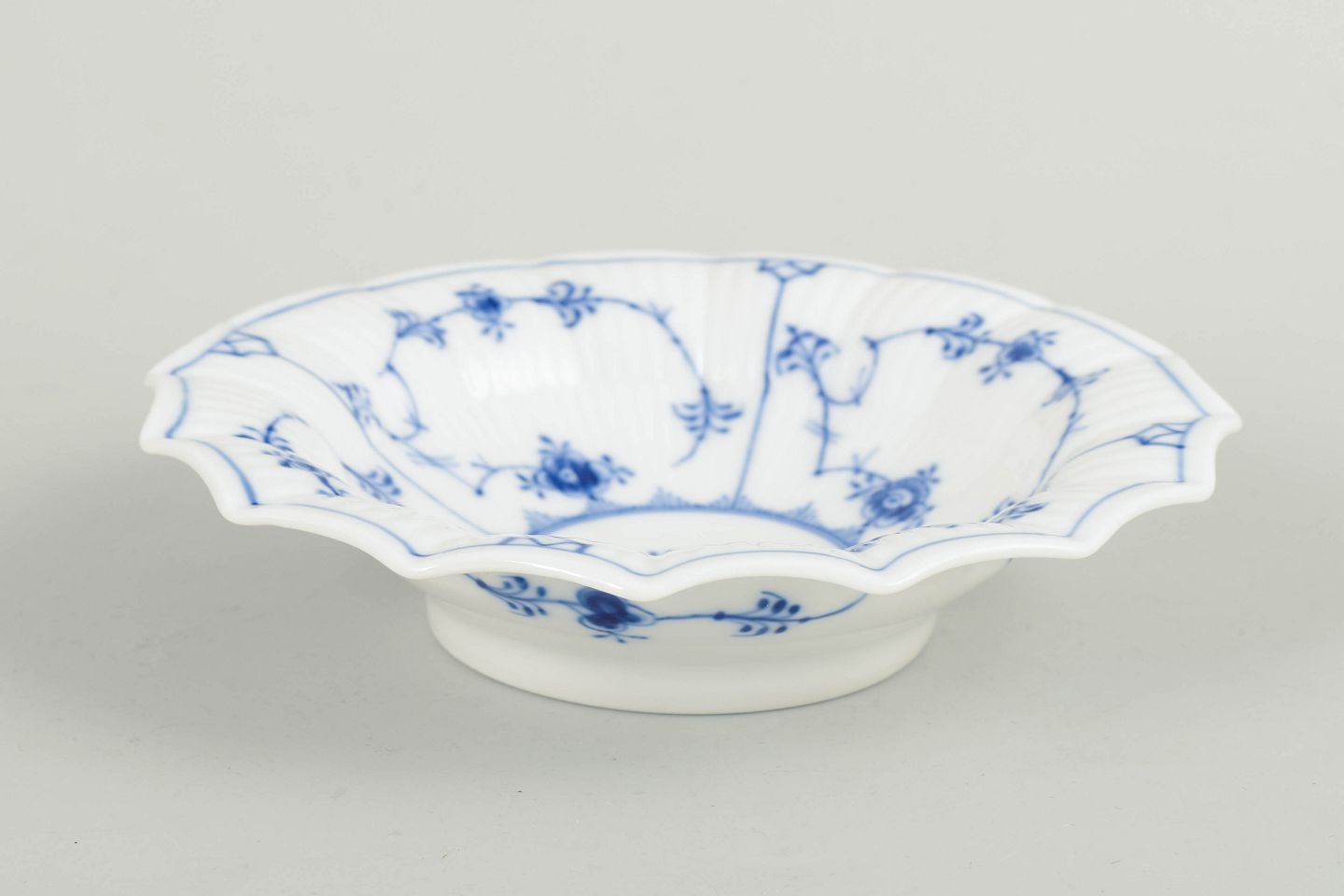 Skål i håndmalet porcelæn fra Musselmalet Riflet med klassisk underglasurdekoration i koboltblå og riflede felter. Model 1/140. Første sortering. Fremstillet 1958.