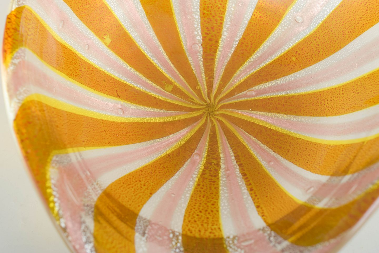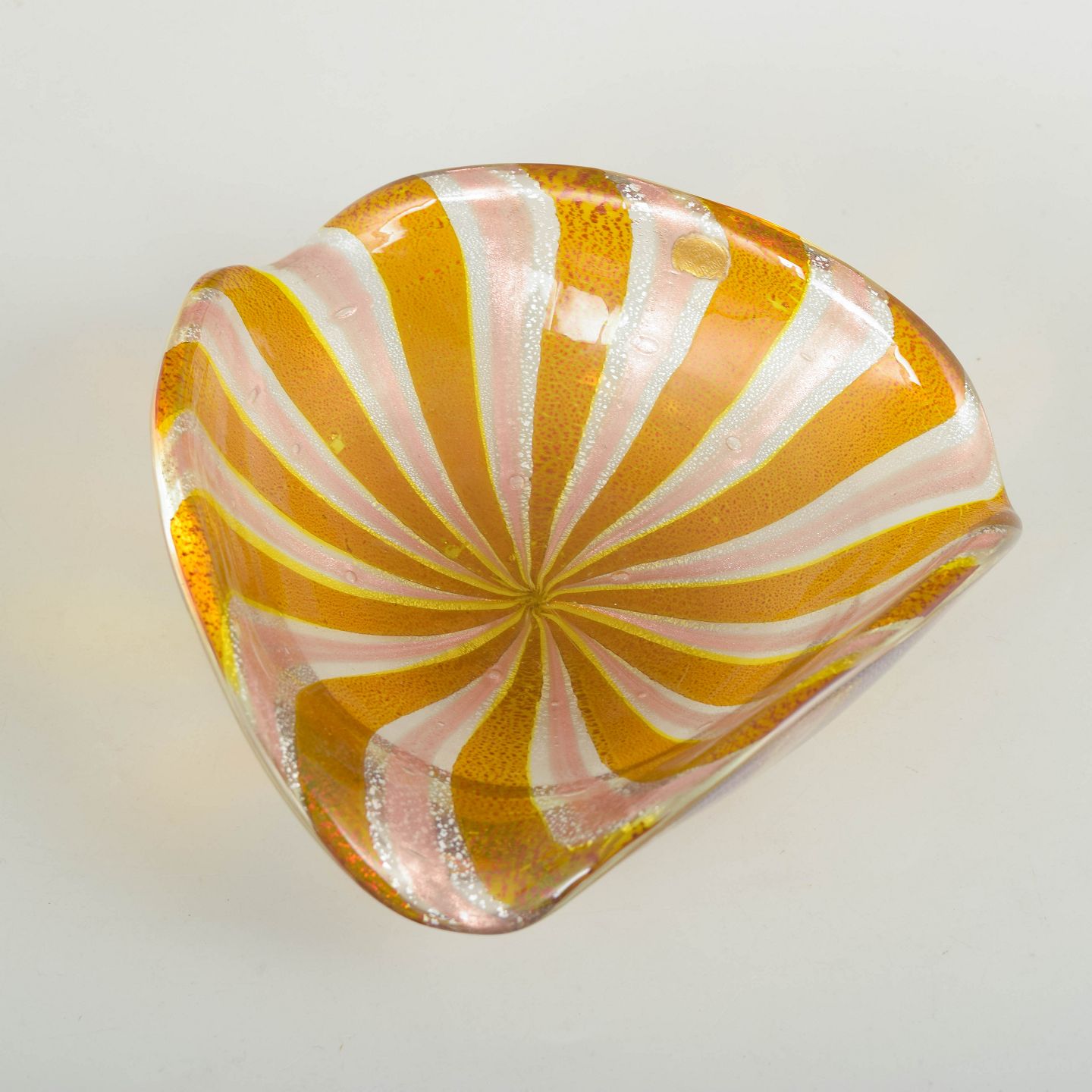 Organisk formet skål i mundblæst glas med snoet rand. Udført i varme gule og hvide striber, aventurin teknik, og iriserende effekt. Mærkat bevaret. Fremstillet på Murano i 1960’erne/70’erne.