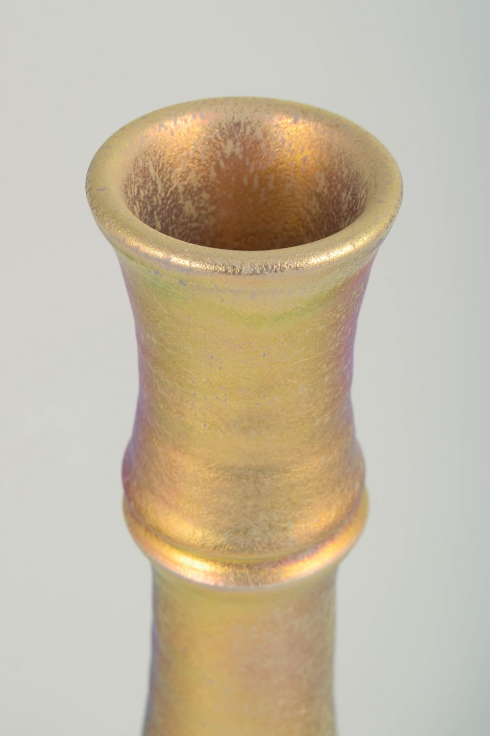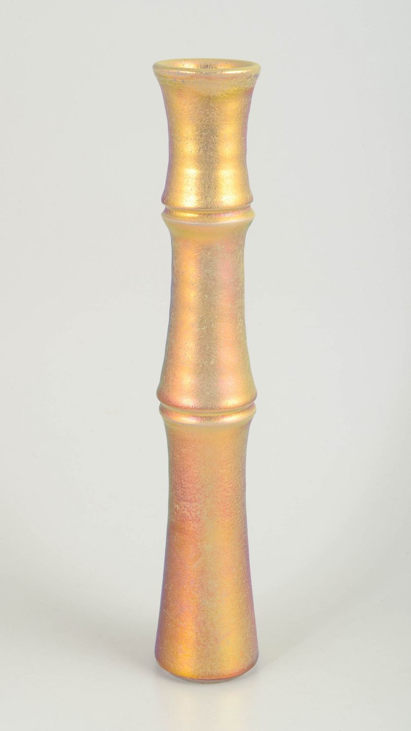 Slank og arkitektonisk udformet vase i stentøj med metallisk, iriserende glasur i gyldne og kobberfarvede nuancer. Vasen har markerede profilerede led og er signeret under bunden.