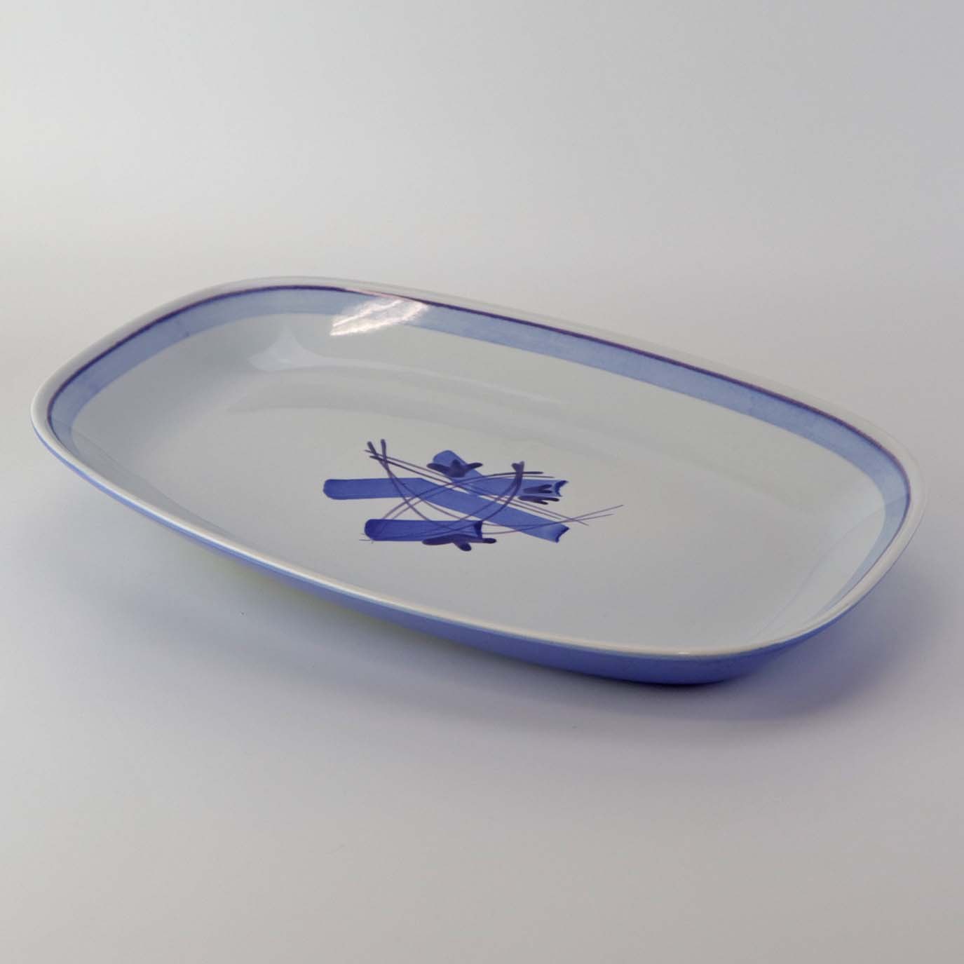 Fajancestel i stelform CA med dekoration af abstrakt motiv i blå og lyseblå på en råhvid baggrund.