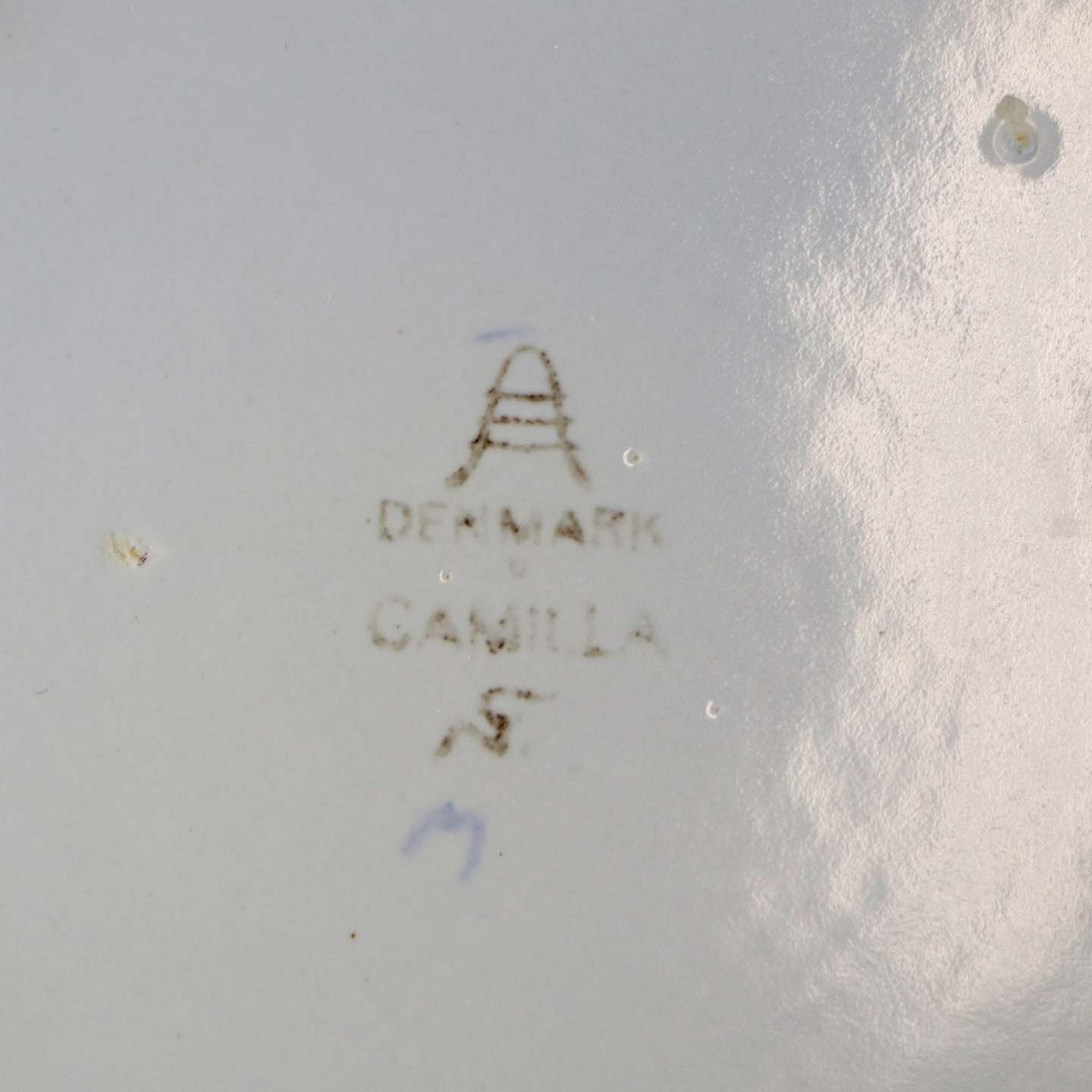 Fremstår med ridser på bagsiden, mindre mørk plet under glasuren.