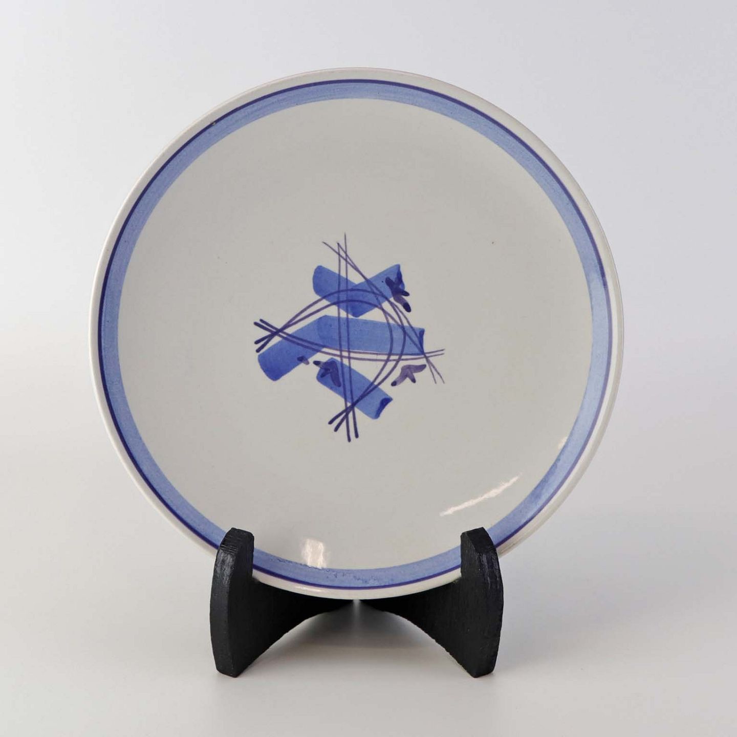 Fajancestel i stelform CA med dekoration af abstrakt motiv i blå og lyseblå på en råhvid baggrund.