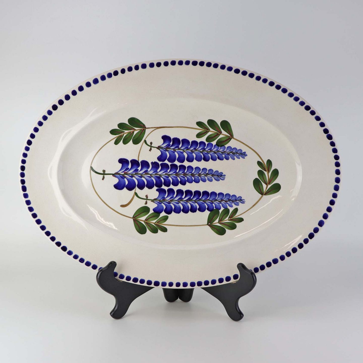 Stort ovalt serveringsfad i fajance fra stellet Blåregn. Stellet er fremstillet i perioden år 1903-1933. Nr. 522/493