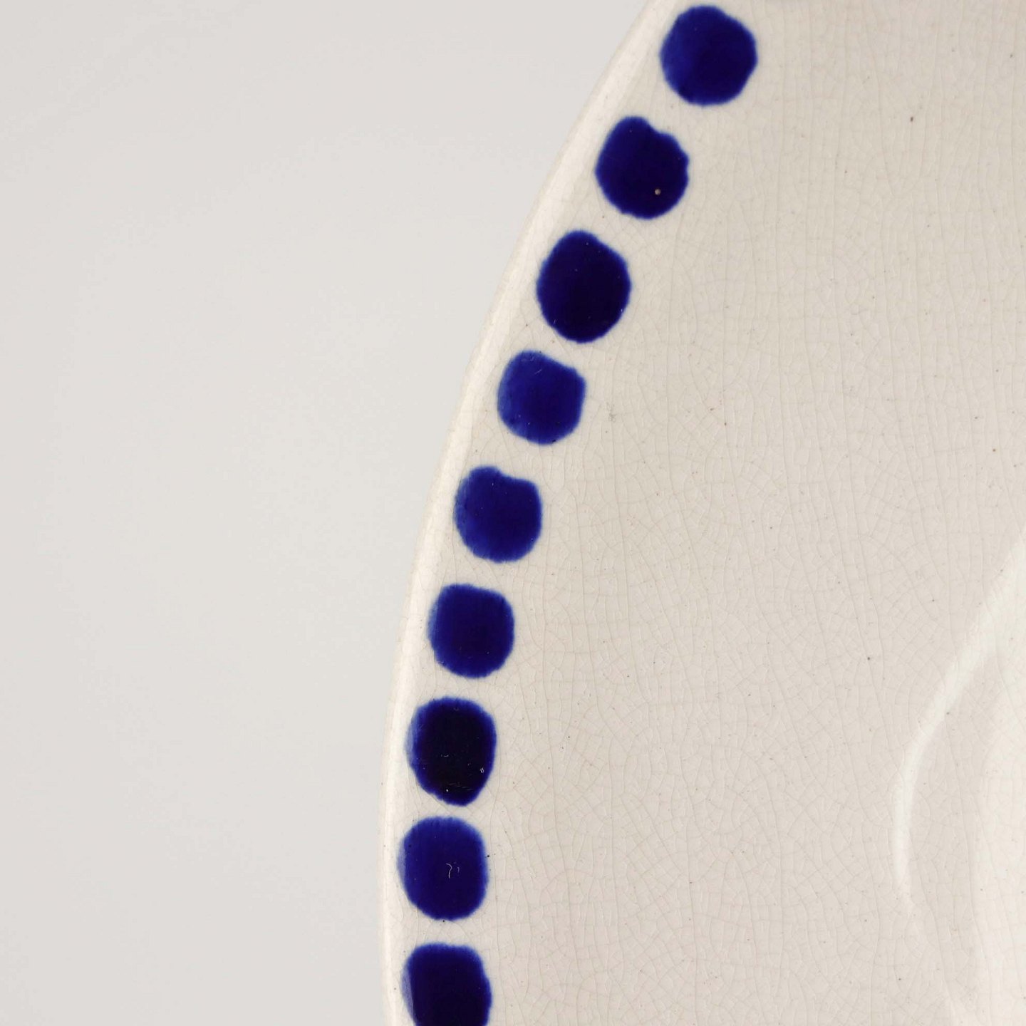 Fajancestel med dekoration af ranker af blåregn og blade på lys baggrund afsluttet med kant af runde blå pletter.